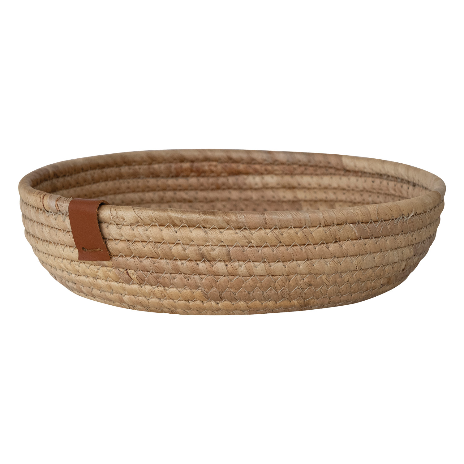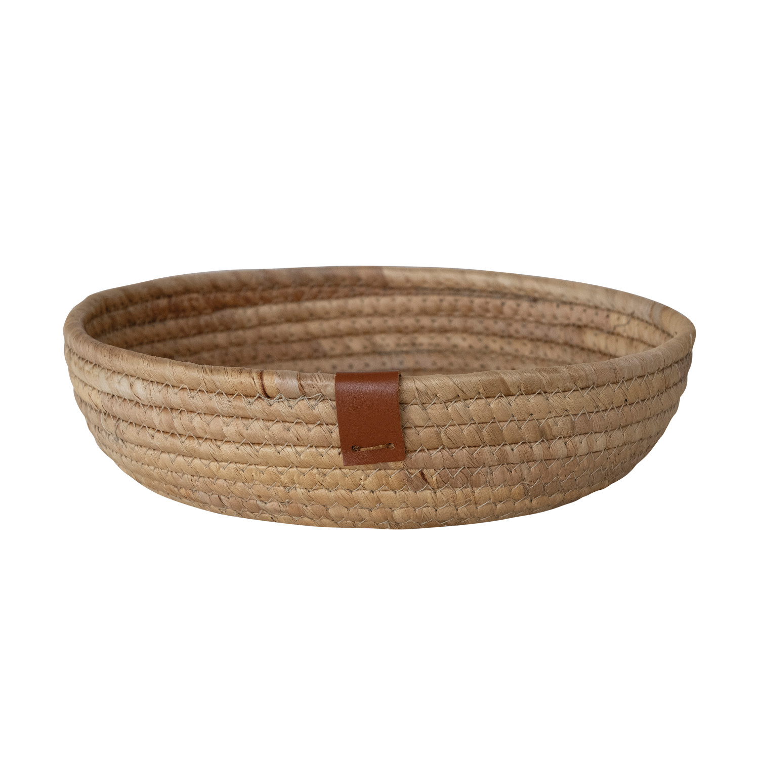 Catalog Name: 11" Round x 2-3/4"H Hand-Woven Seagrass & Water Hyacinth Basket w/ Faux Leather Tab, Natural