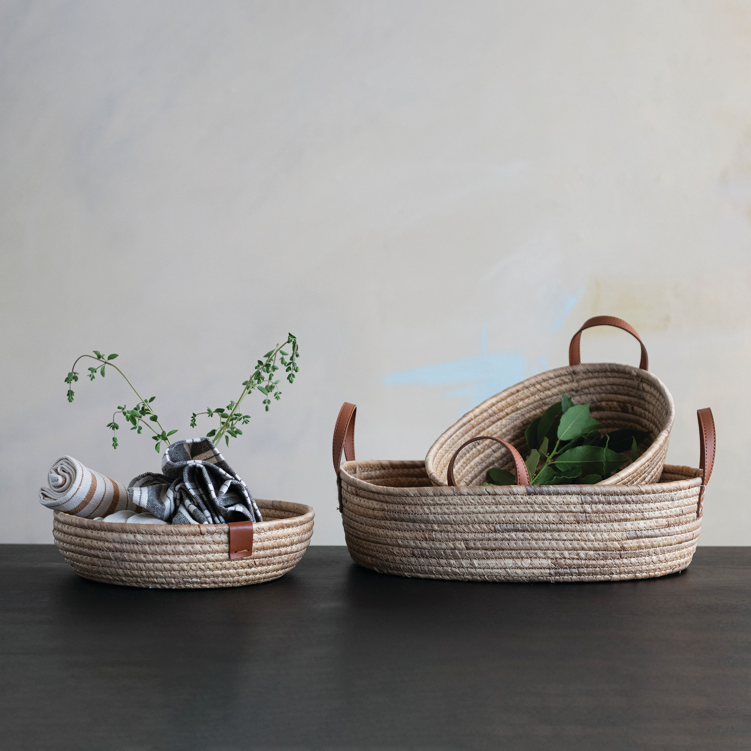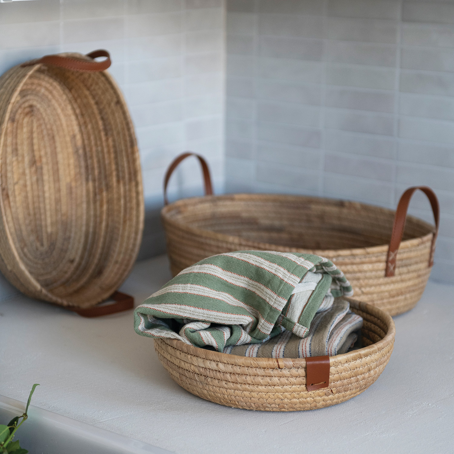 Hand-Woven Seagrass & Water Hyacinth Basket with Faux Leather Tab, Natural