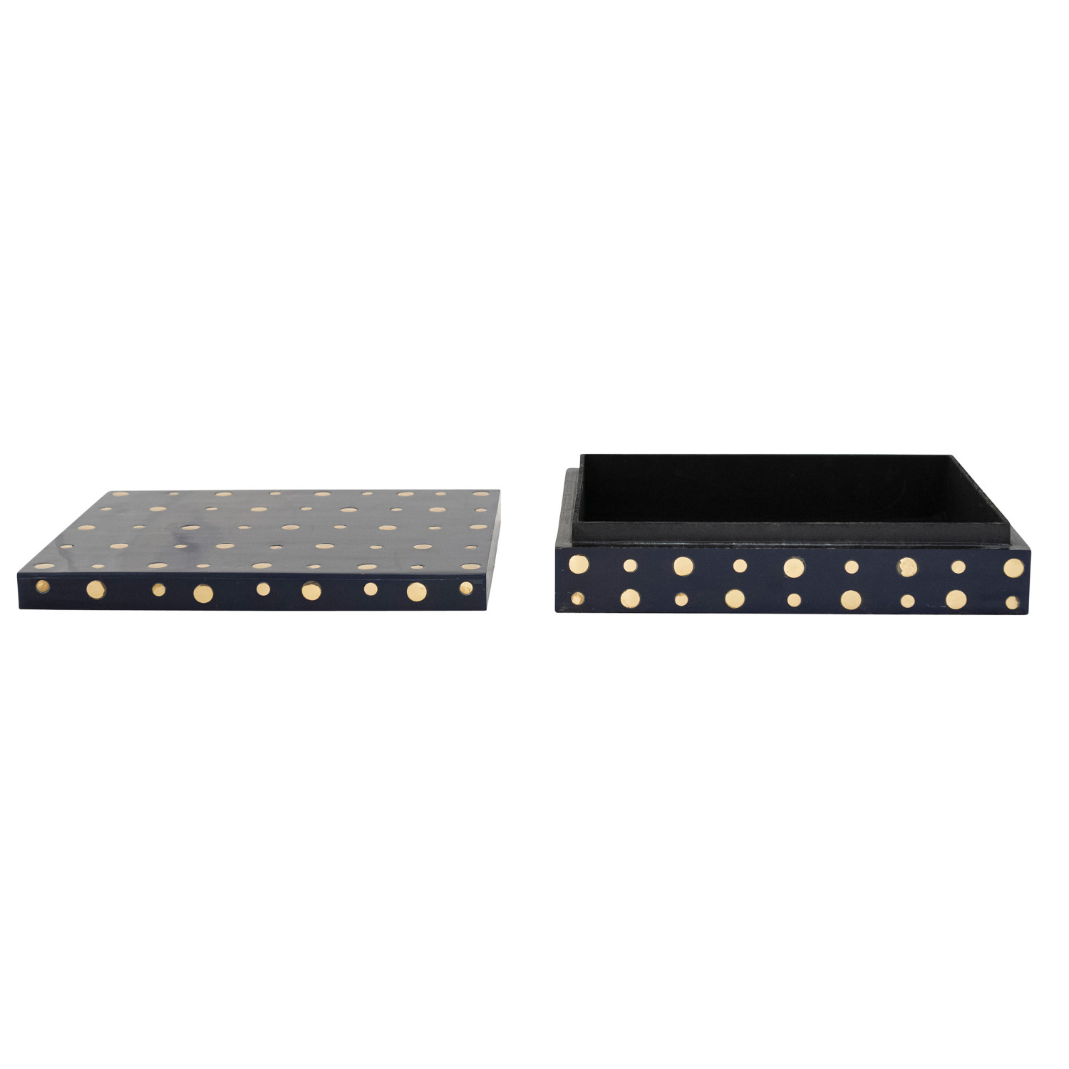 Catalog Name: 9"L x 7"W x 2-1/2"H Resin, Brass & MDF Studded Box, Navy Color (Each One Will Vary)