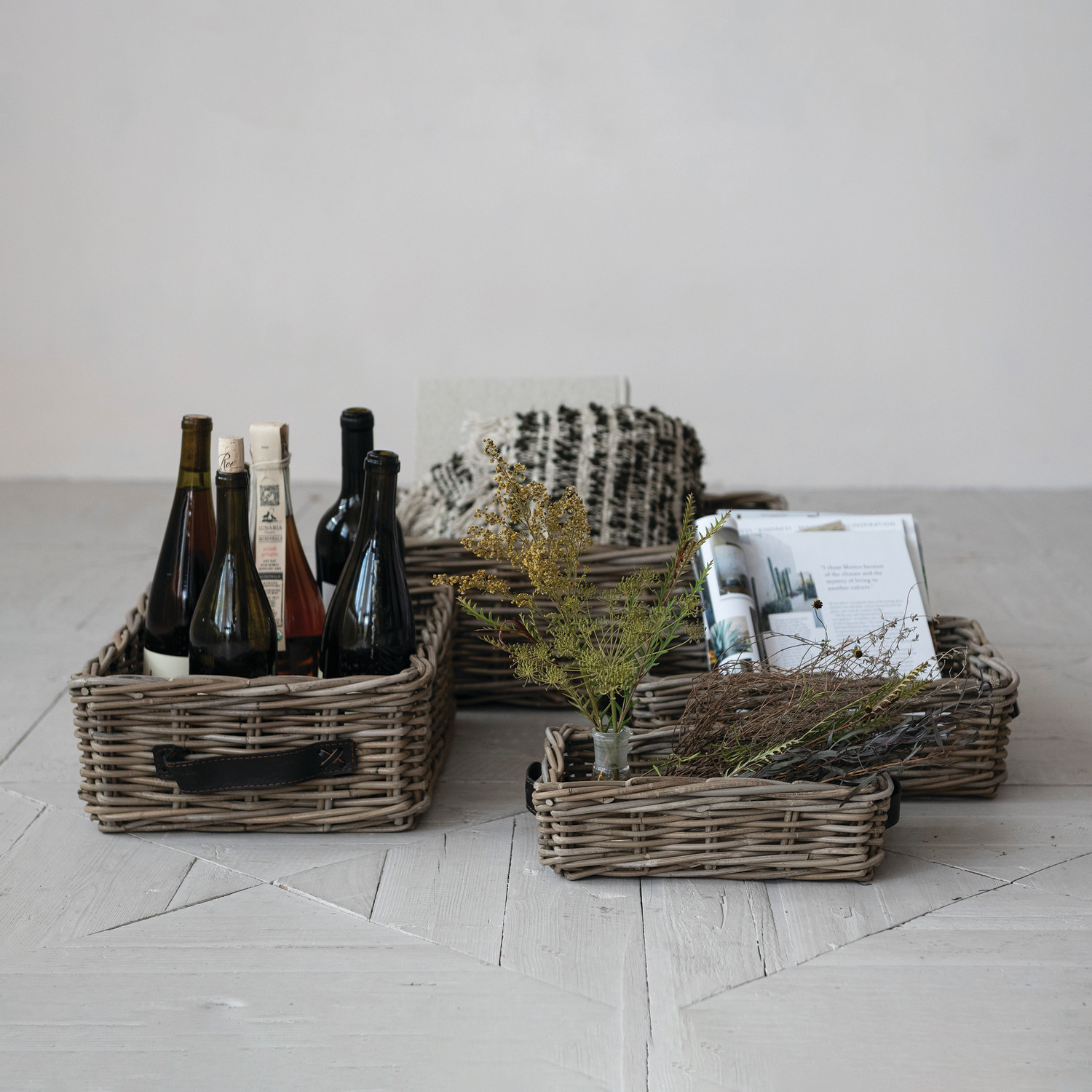 Catalog Name: 20"L x 15-3/4"W x 7"H, 17"L x 12-1/2"W x 6"H, 14"L x 10-1/4"W x 4-3/4"H & 11-1/2"L x 8-1/4"W x 3-1/2"H Hand-Woven Rattan Nesting Baskets w/ Leather Handles, Grey Washed, Set of 4