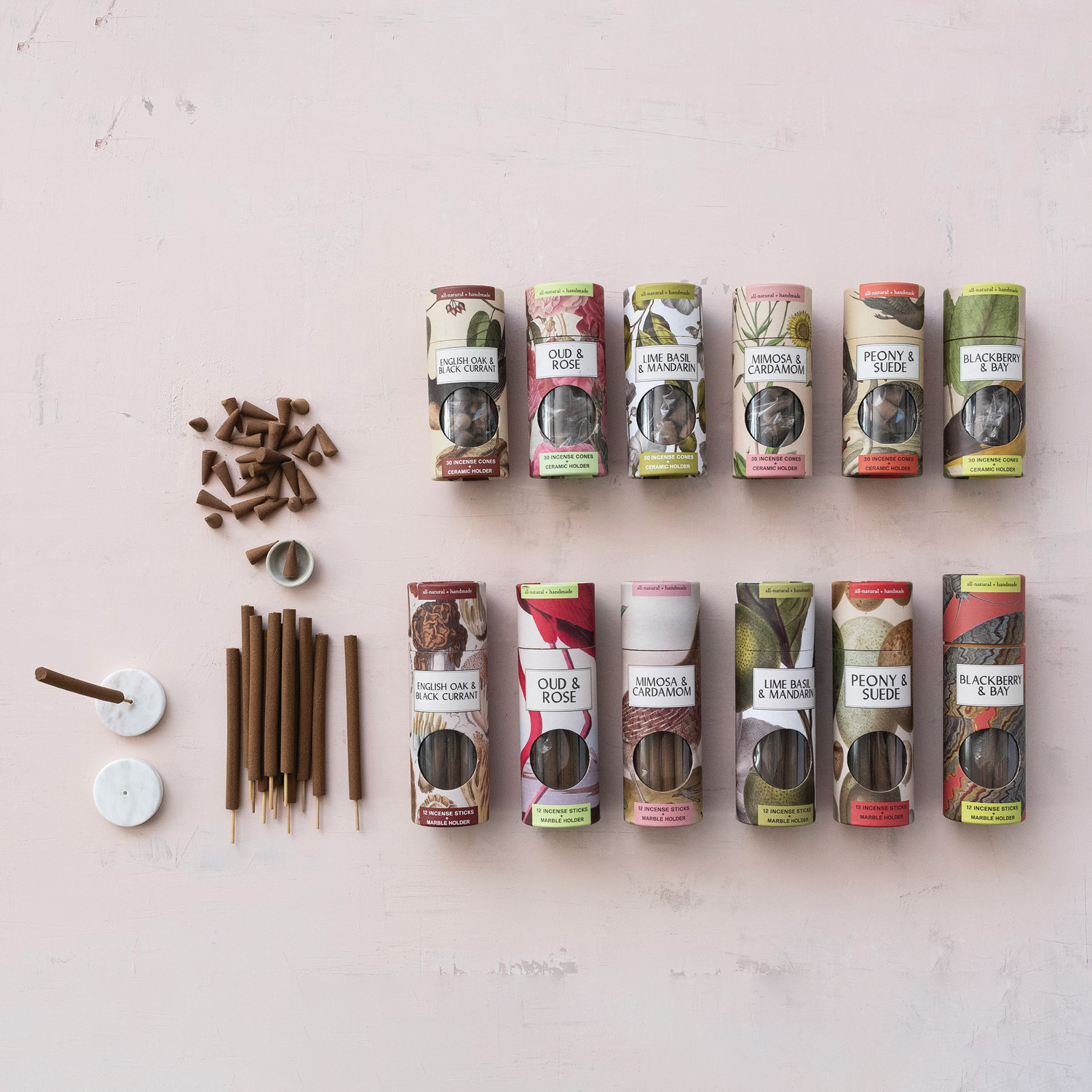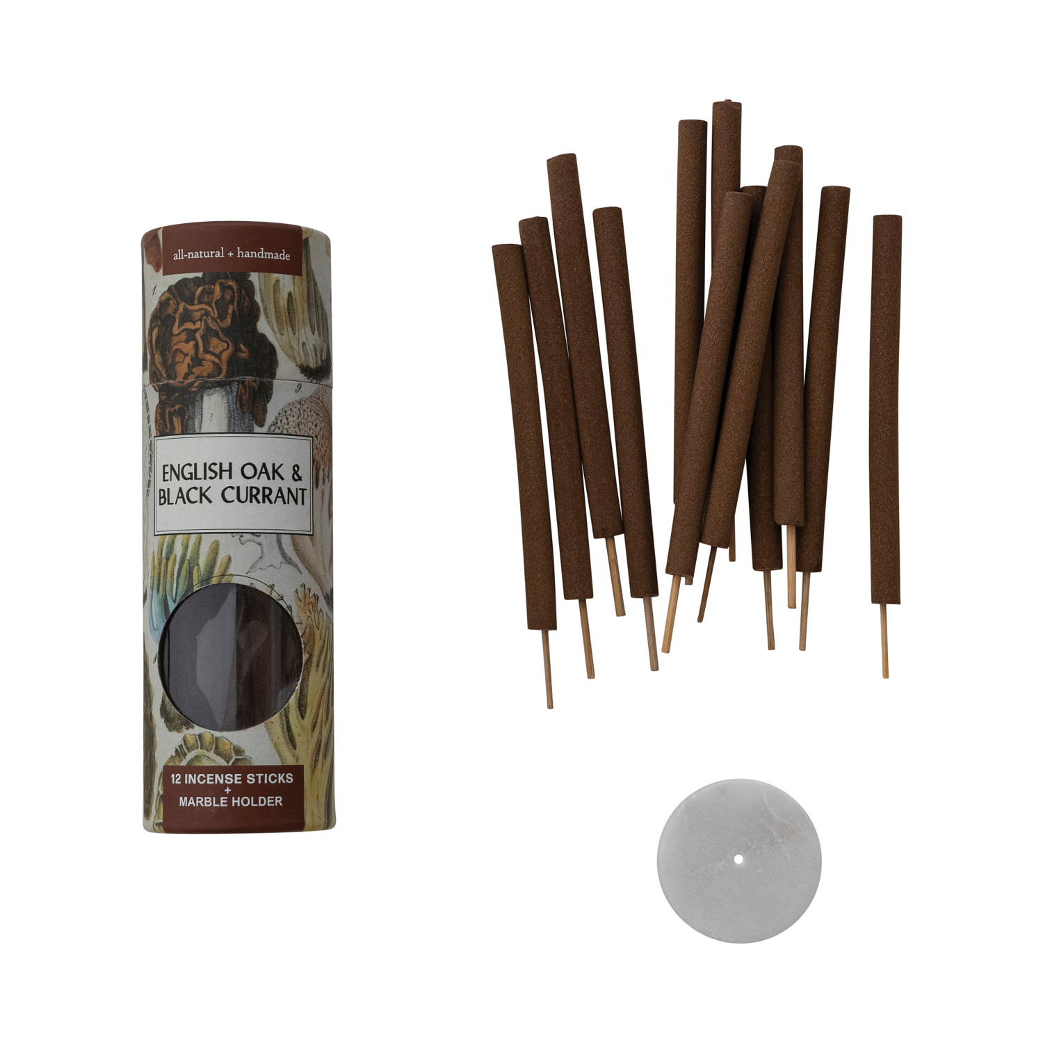 Catalog Name: 6"L 12 Piece All Natural Handmade English Oak & Black Currant Scented Thick Incense Sticks in Printed Tube w/ 2" Round White Marble Incense Holder, Set of 13 (Est. Burn Time 45 Minutes)