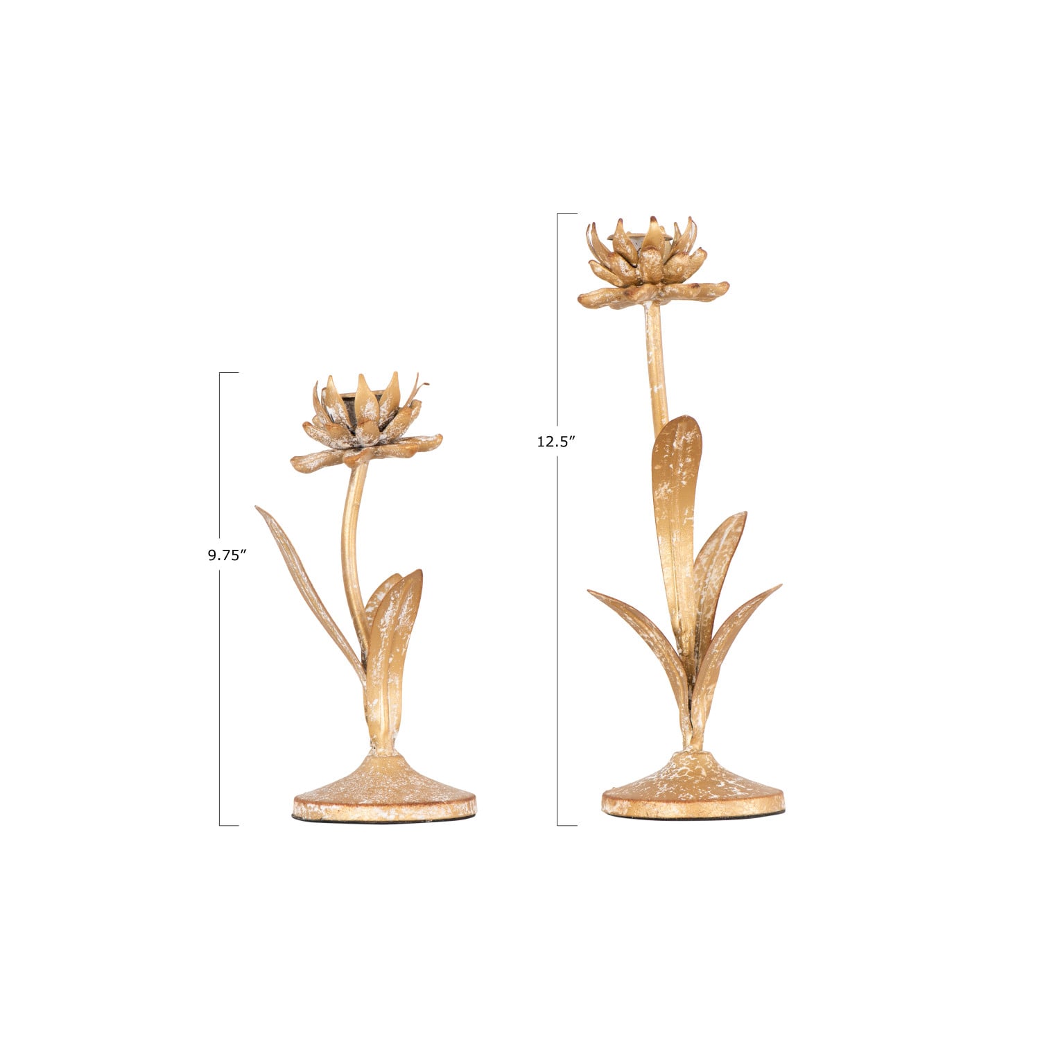 Catalog Name: 12-1/2"H & 9-3/4"H Metal Flower Taper Holders, Gold Finish & White, Set of 2