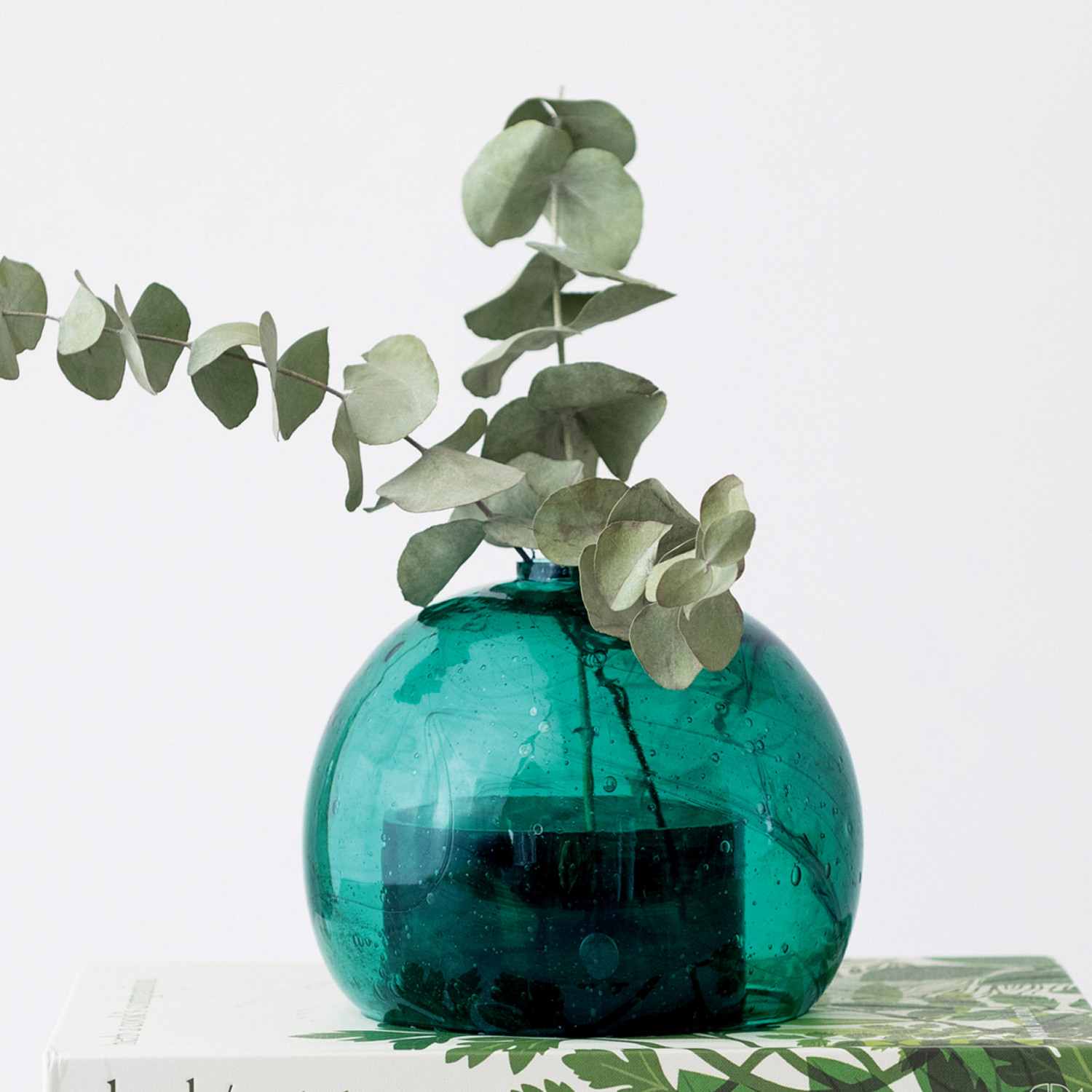 This eclectic tealight holder showcases a glass cloche in a bold hue.
