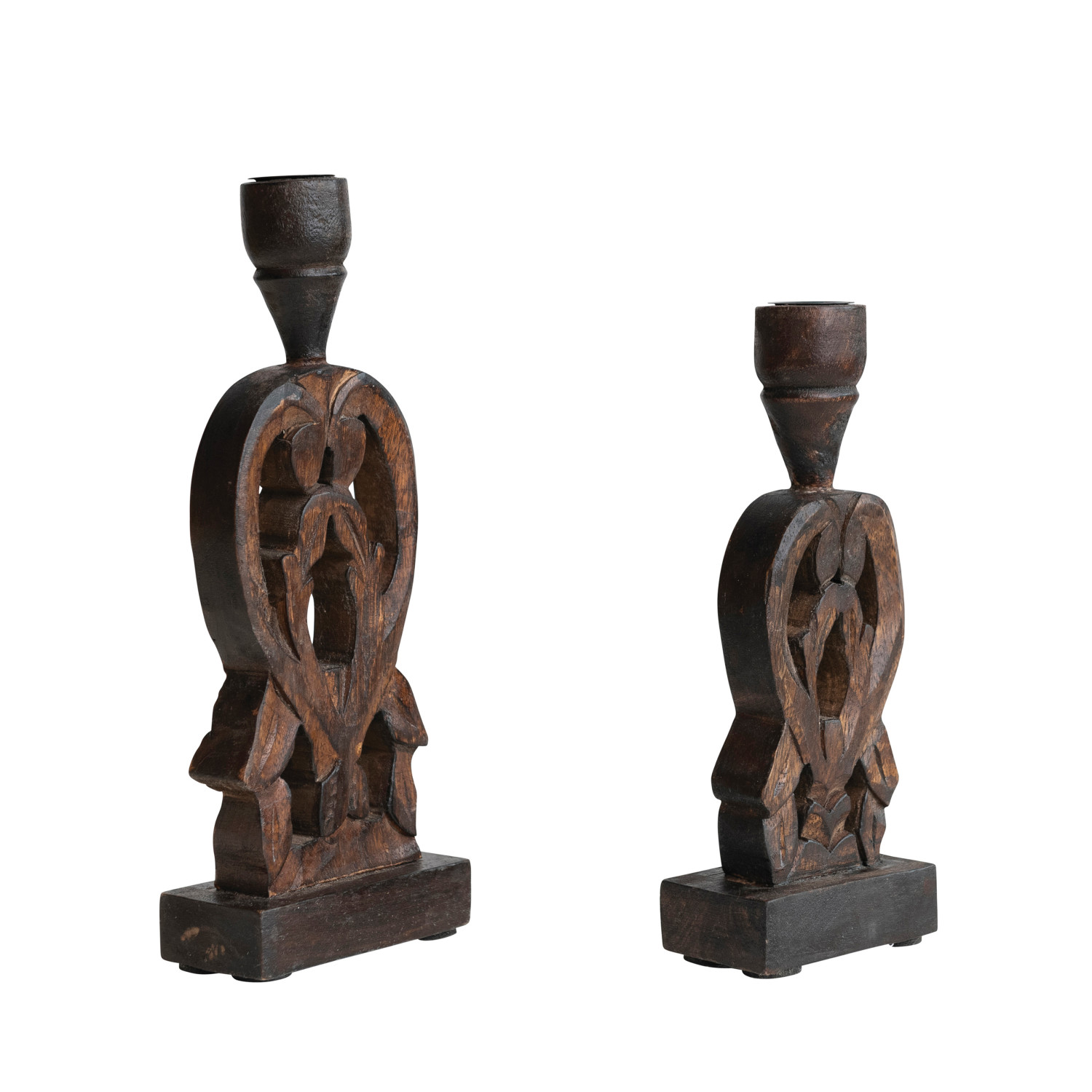 Hand-Carved Mango Wood Taper Holders, Walnut Finish, Set of 2