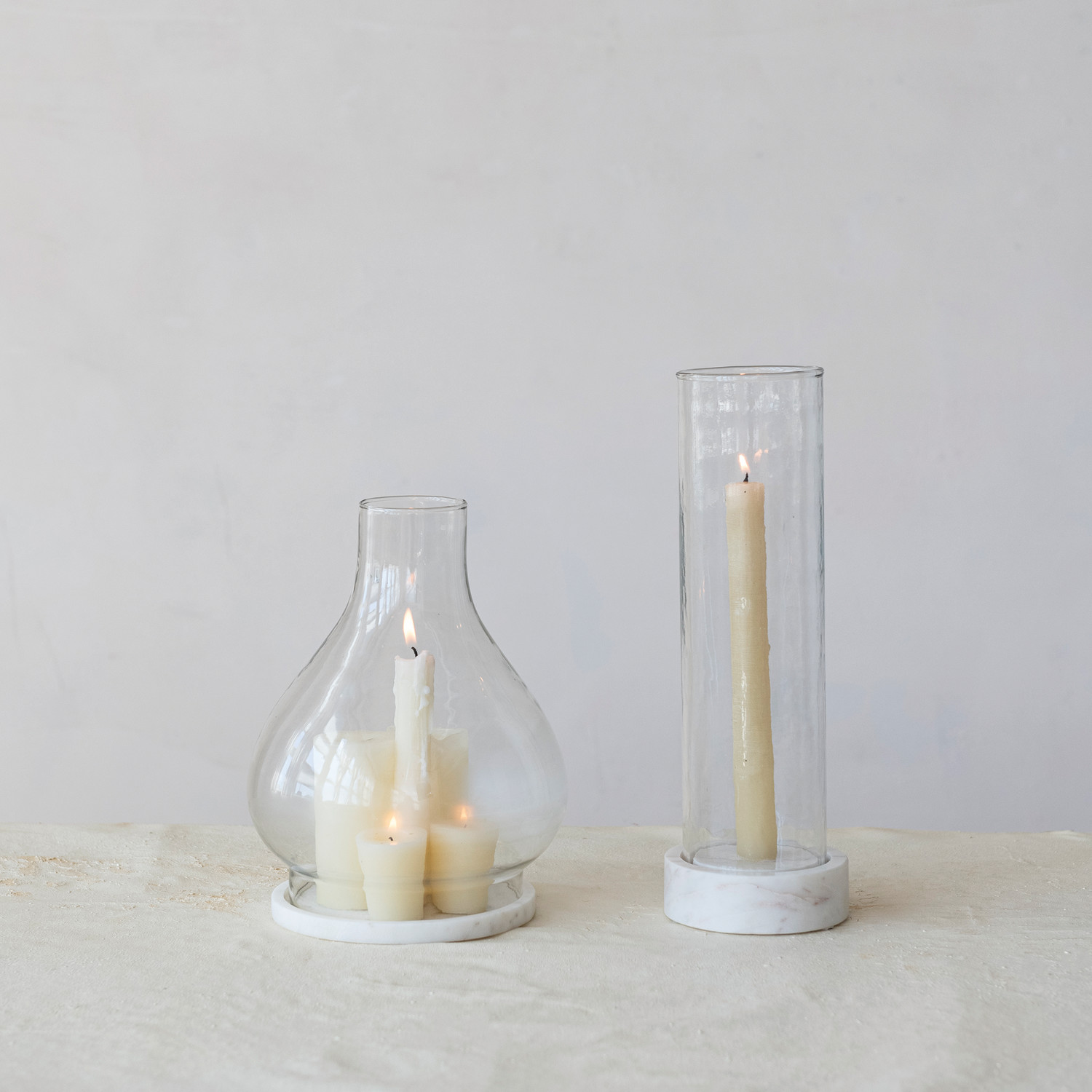 Catalog Name: 7-3/4" Round x 9-3/4"H Glass Hurricane w/ Marble Base, White, Set of 2