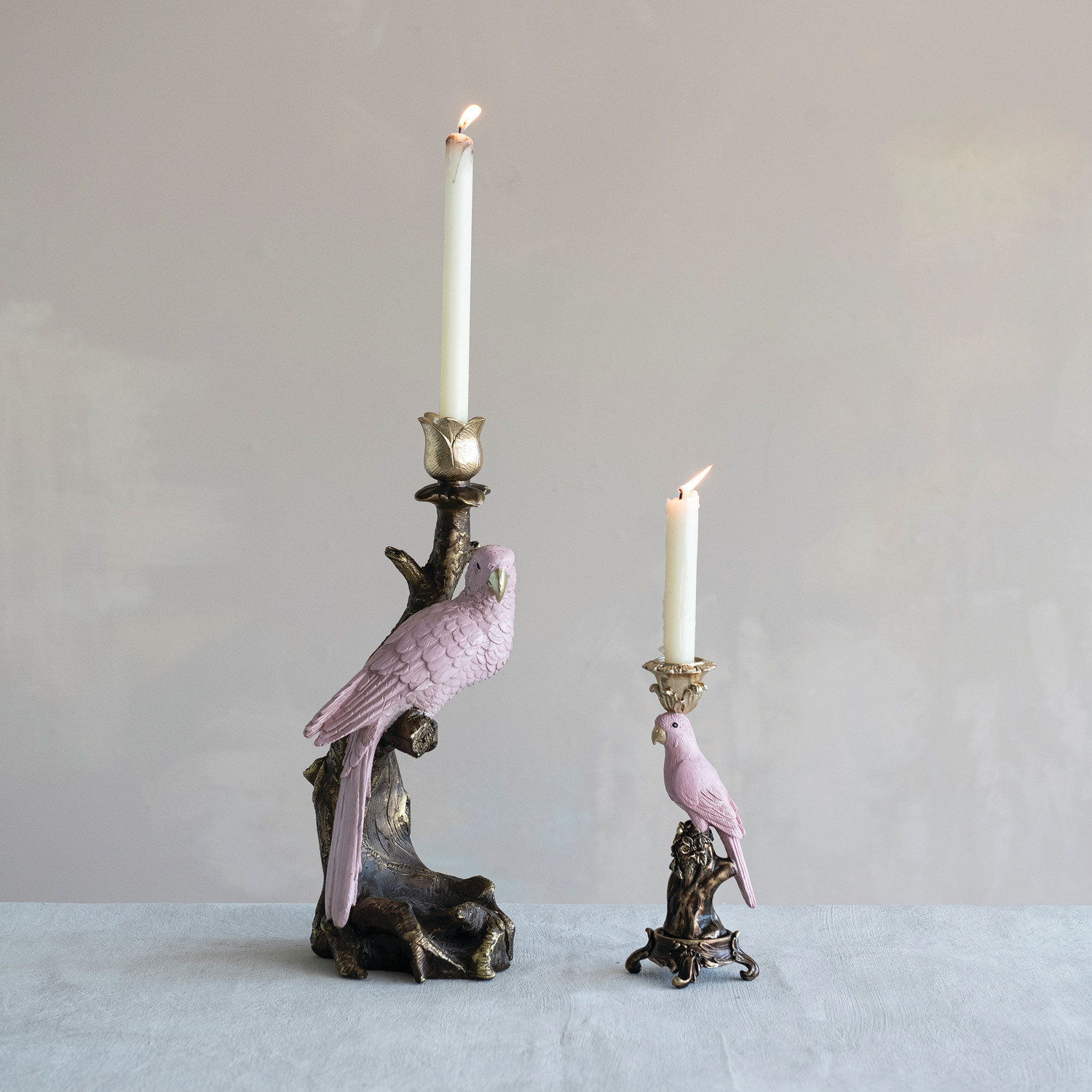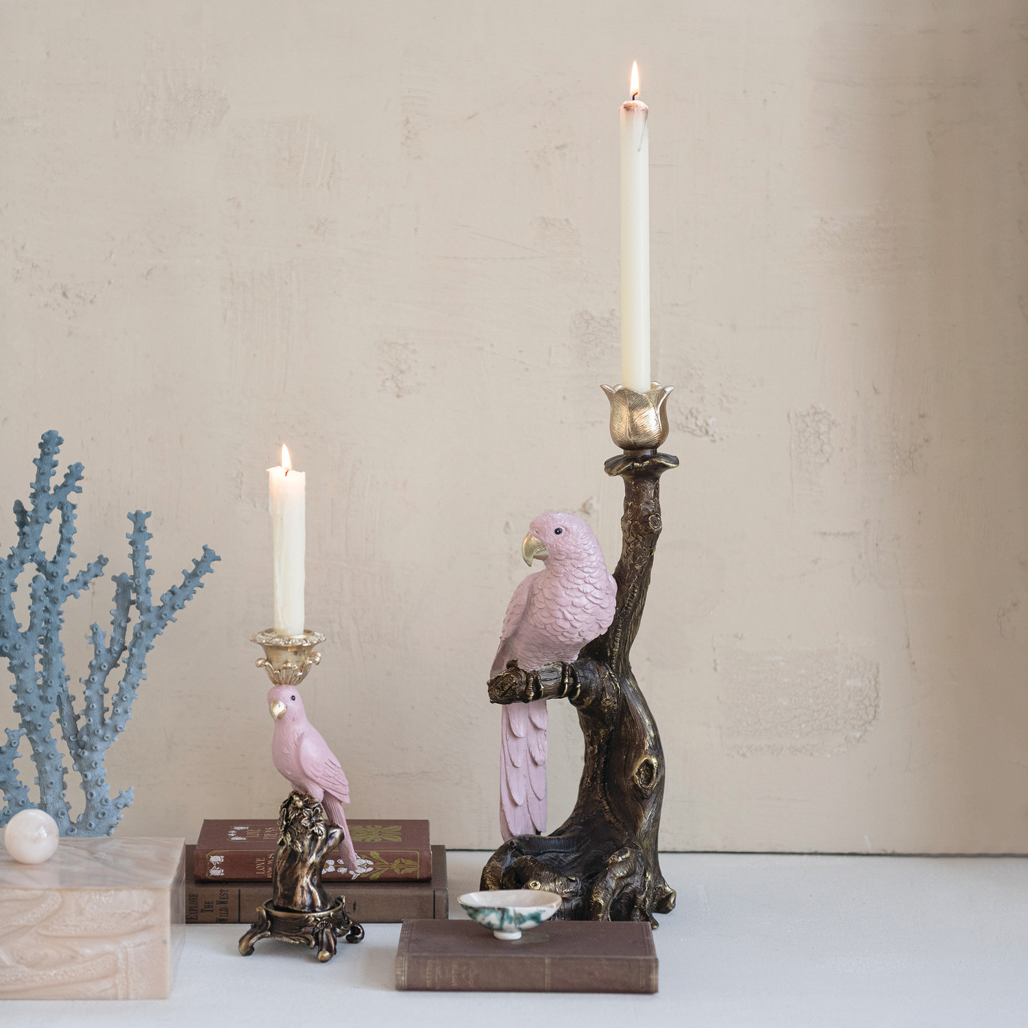 Catalog Name: 6-1/2"L x 6"W x 16"H Resin Taper Holder w/ Parrot on Branch, Antique Gold Finish & Pink
