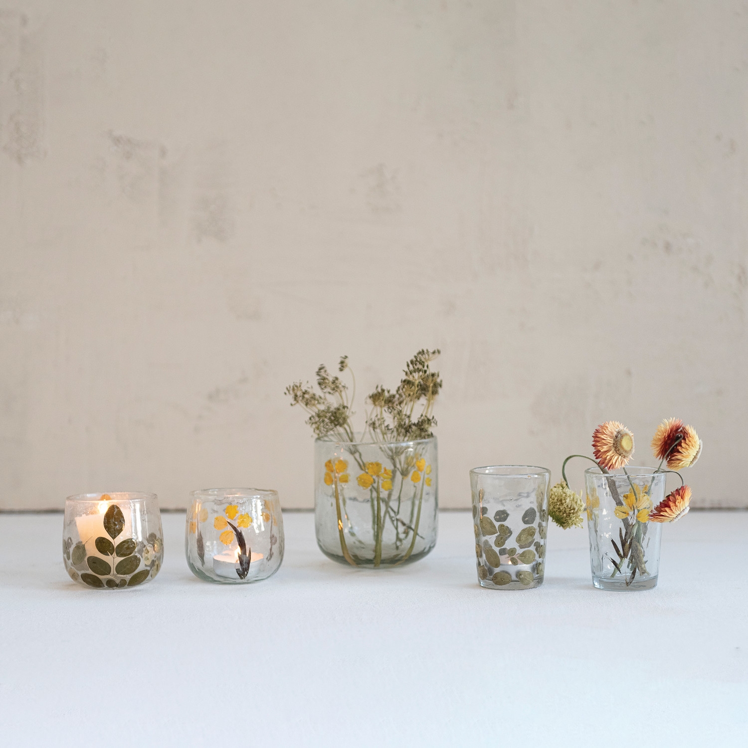 Handmade Glass Tealight/Votive Holder with Embedded Natural Moringa Leaves