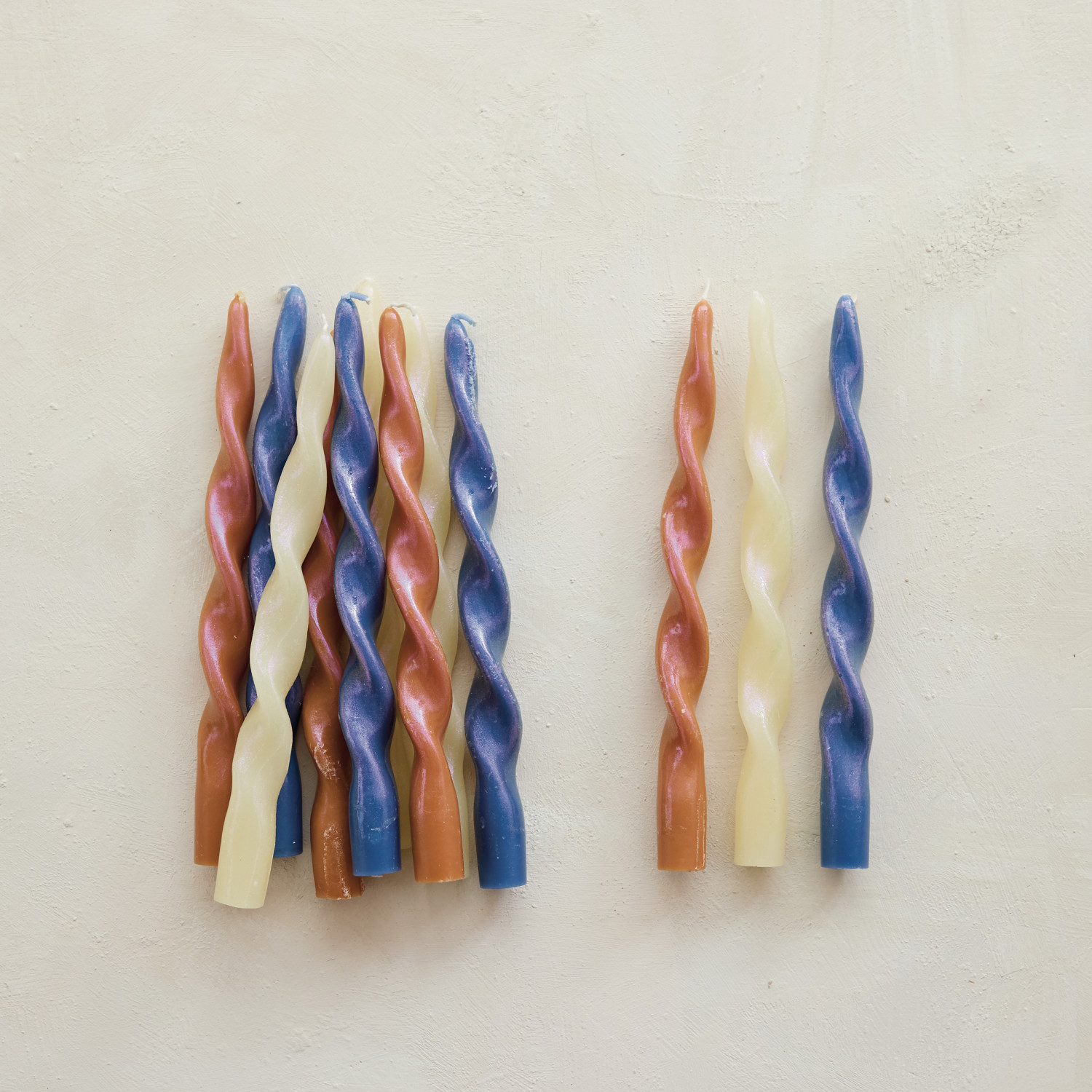Catalog Name: 10"H Unscented Twisted Taper Candles in Box, Iridescent Rainbow Finish, Brown Sugar Color, Set of 2 (Est. Burn Time 6 Hours)