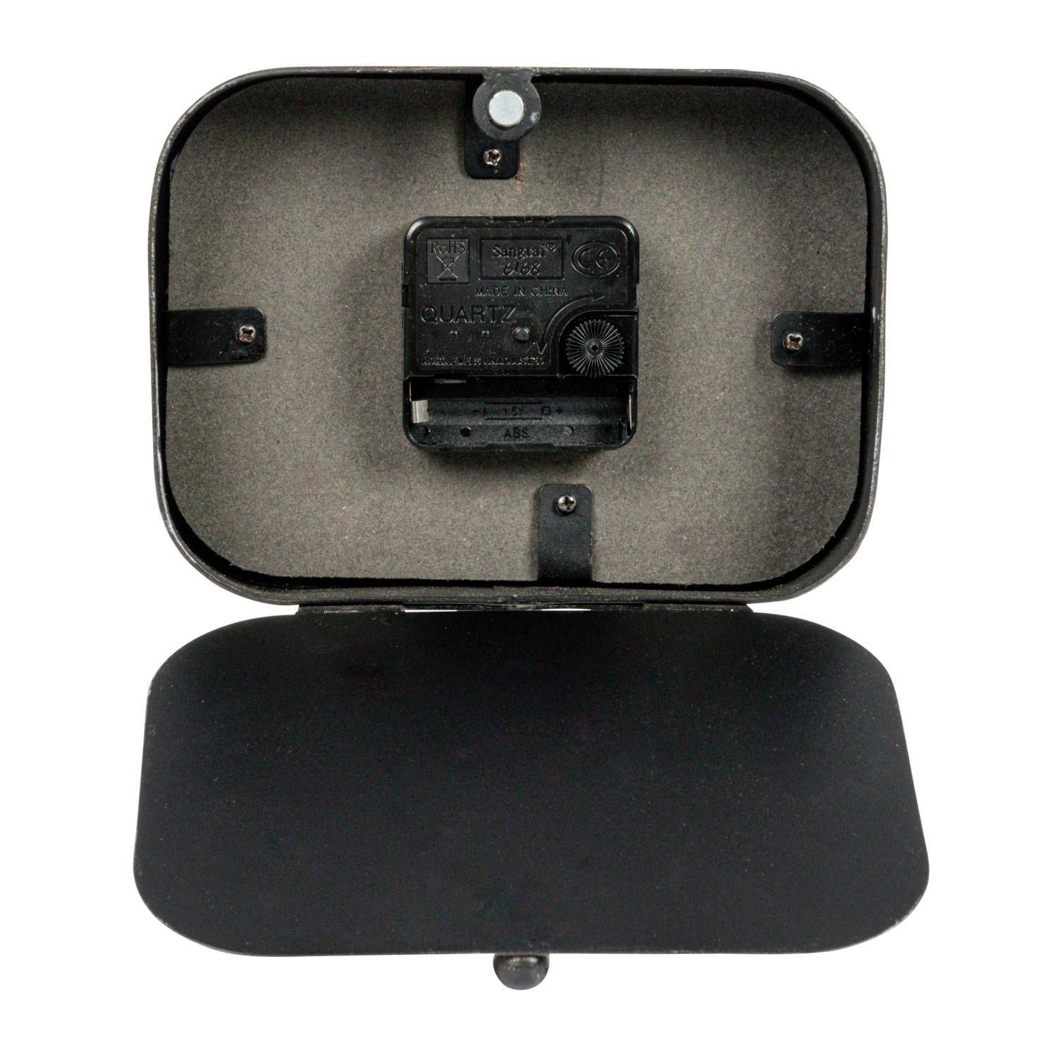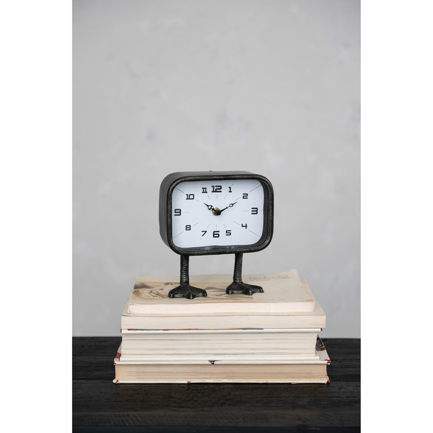 Catalog Name: 6-3/4"L x 3-3/4"W x 7-3/4"H Metal Clock w/ Duck Feet, Gunmetal Finish (Requires 1-AA Battery)
