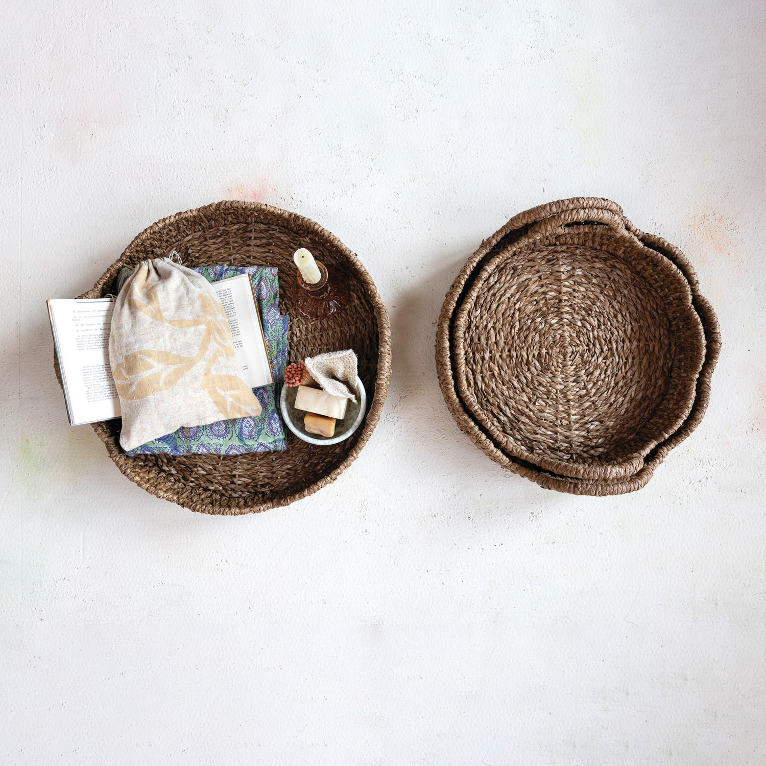 Decorative Braided Bankuan & Rattan Trays w/ Scalloped Edge & Handles, Set of 3