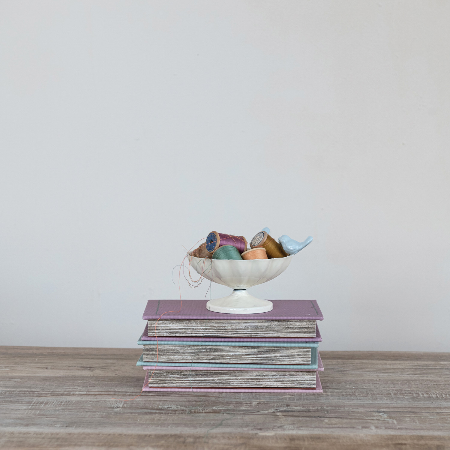 Catalog Name: 5"L x 5-3/4"W x 3-1/2"H Decorative Metal Scalloped Footed Bowl w/ 3D Cast Iron Birds on Rim, Antique White & Blue
