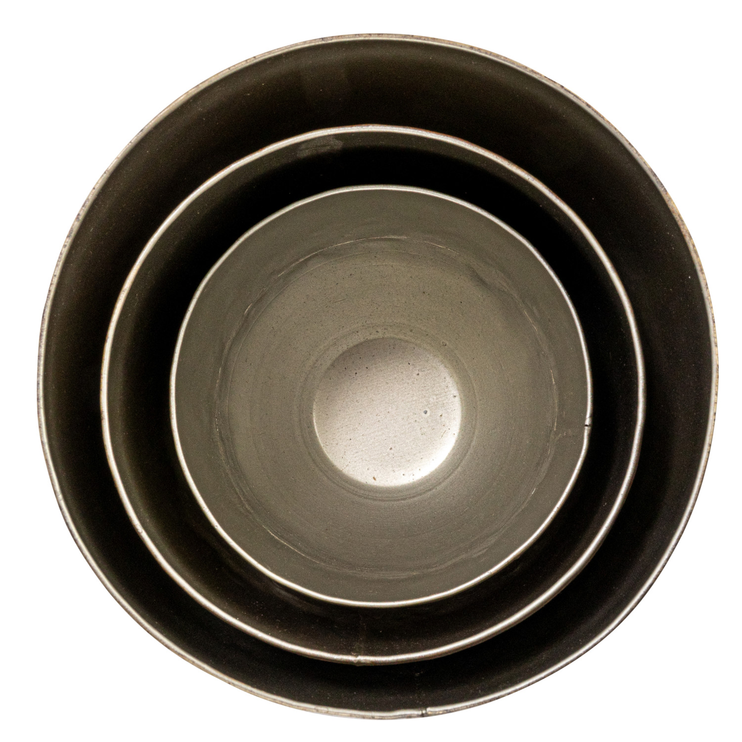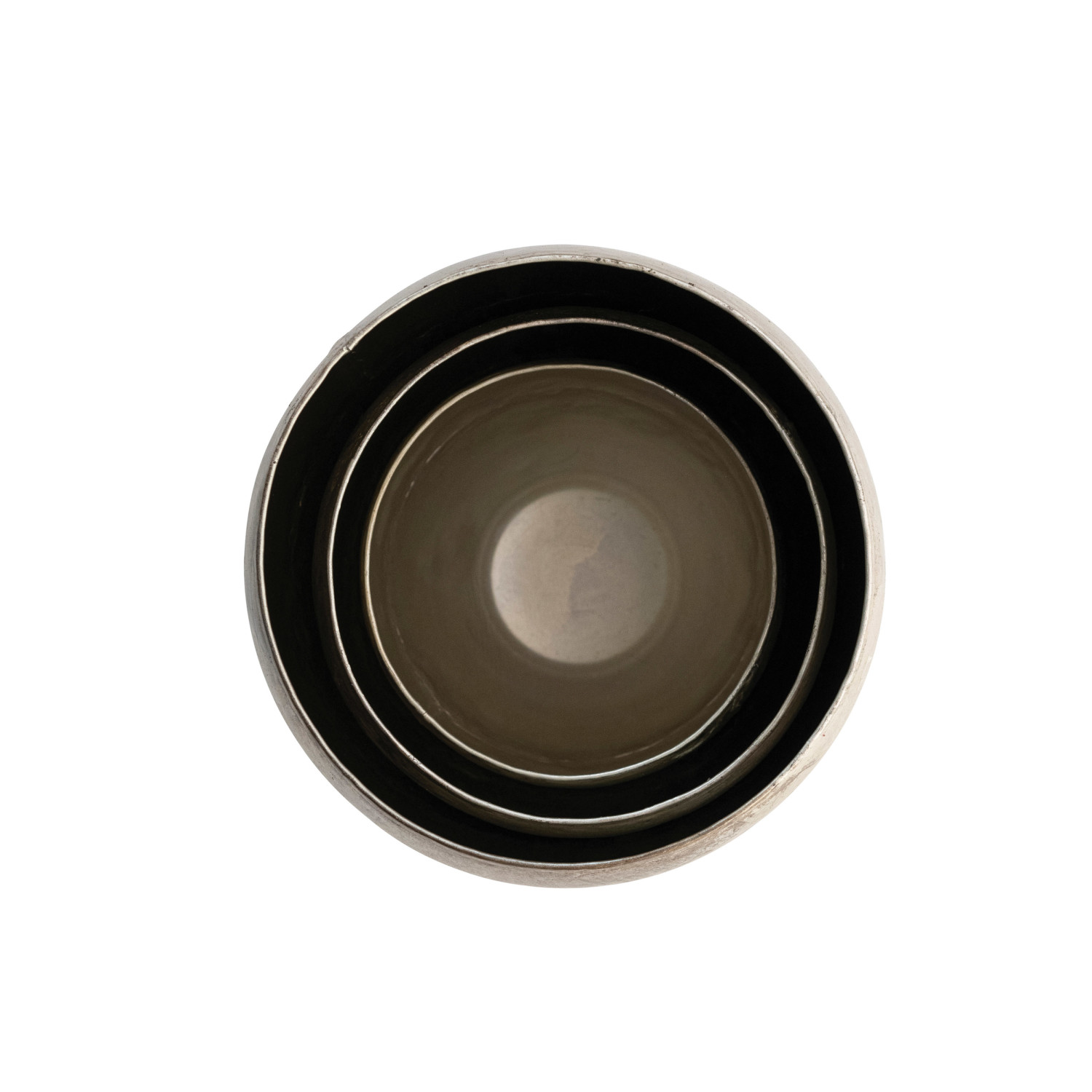 Catalog Name: 7" Round x 6-1/2"H, 6" Round x 5-1/2"H & 5" Round x 4-1/2"H Metal Planters, Distressed Pewter Finish, Set of 3 (Holds 6", 5" & 4" Pots)