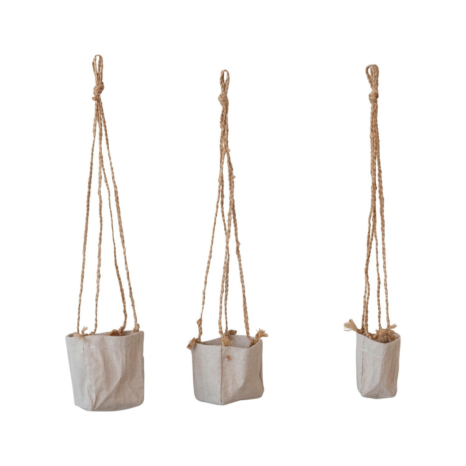 Catalog Name: 5-1/2" Round x 6"H, 4" Round x 5"H & 3" Round x 5"H Decorative Hanging Jute & Cotton Planters w/ Rope Hanger, Natural, Set of 3 (Holds 5", 3" & 2" Pots)