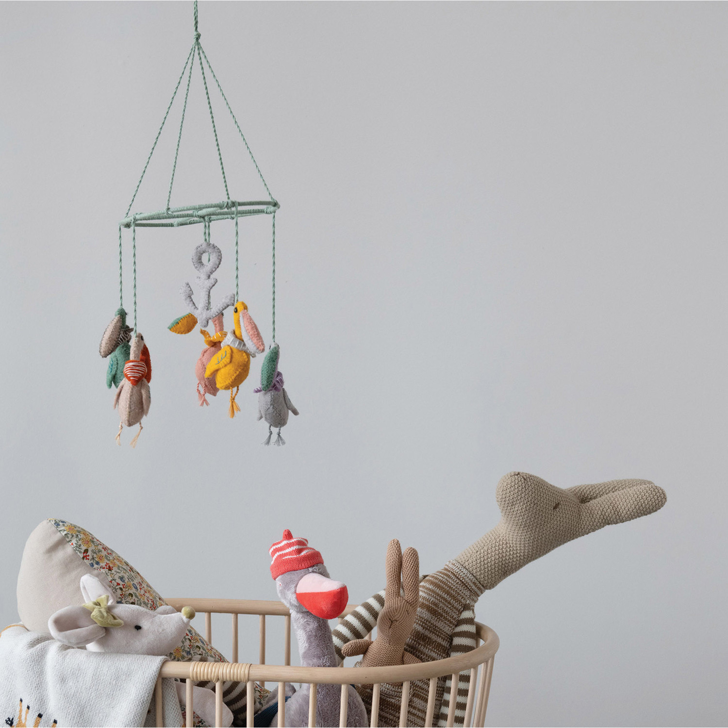 This wool felt mobile displays creative, and cute anchor and pelicans in a variety of colors. Mobile accessory colors are warm greys, and sage green with fun pops of lavender, peach, and mustard. An adorable accent piece for a baby's nursery that can transition to a fun ceiling decoration in a toddler's room. Hand-stitching details add an extra special design element to each mobile accessory piece.