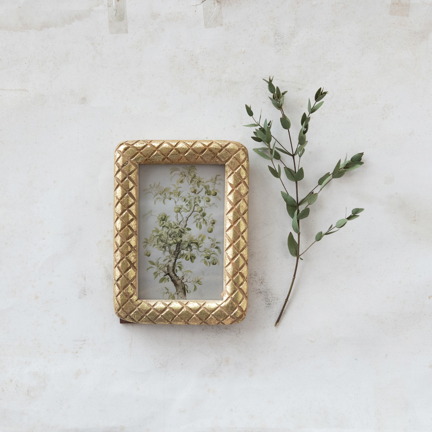 Catalog Name: 5-1/4"L x 7-1/4"H Carved Mango Wood Photo Frame w/ Diamond Pattern, Gold Foil Finish (Holds 4" x 6" Photo)