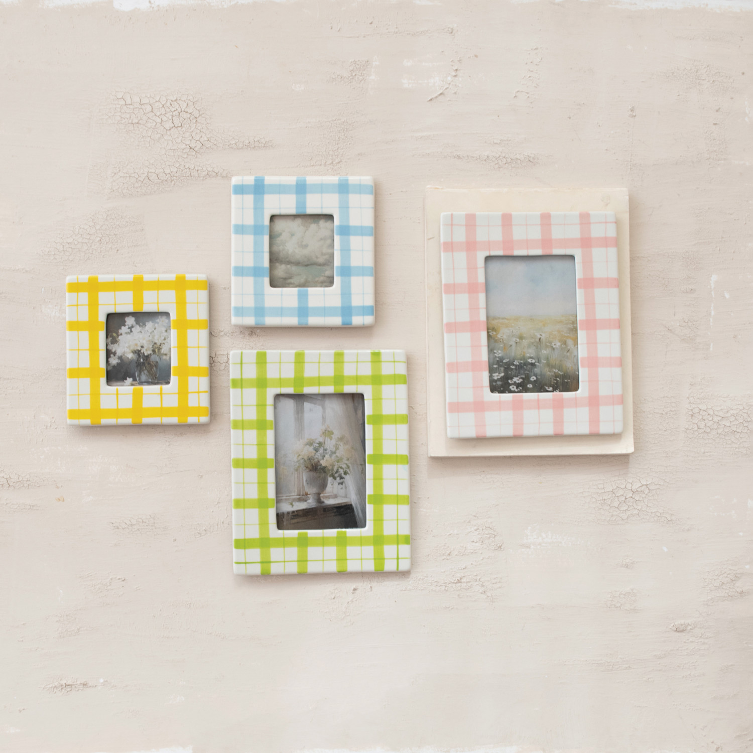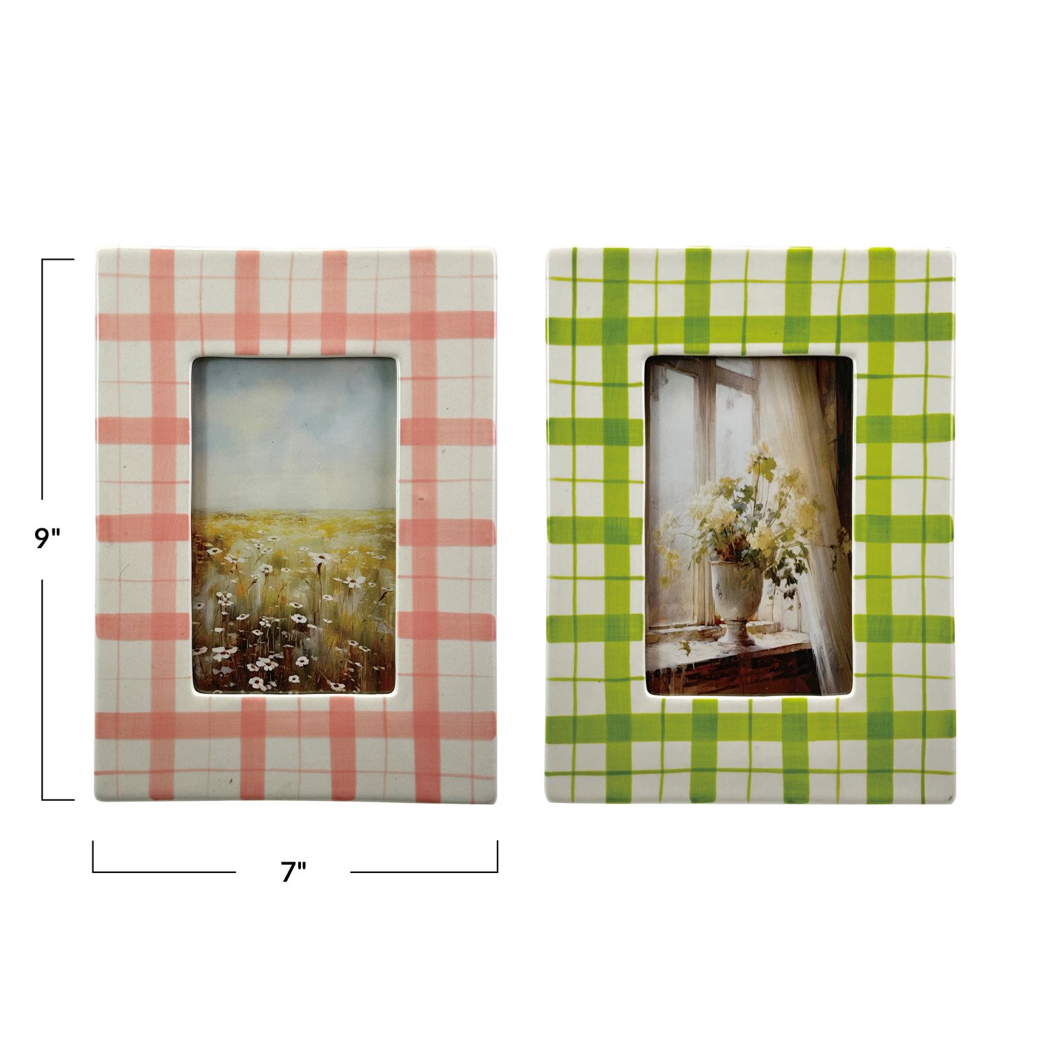 Catalog Name: 7"W x 9"H Hand-Painted Stoneware Photo Frame w/ Plaid Pattern, 2 Colors (Holds 4" x 6" Photo) (Hangs or Sits)