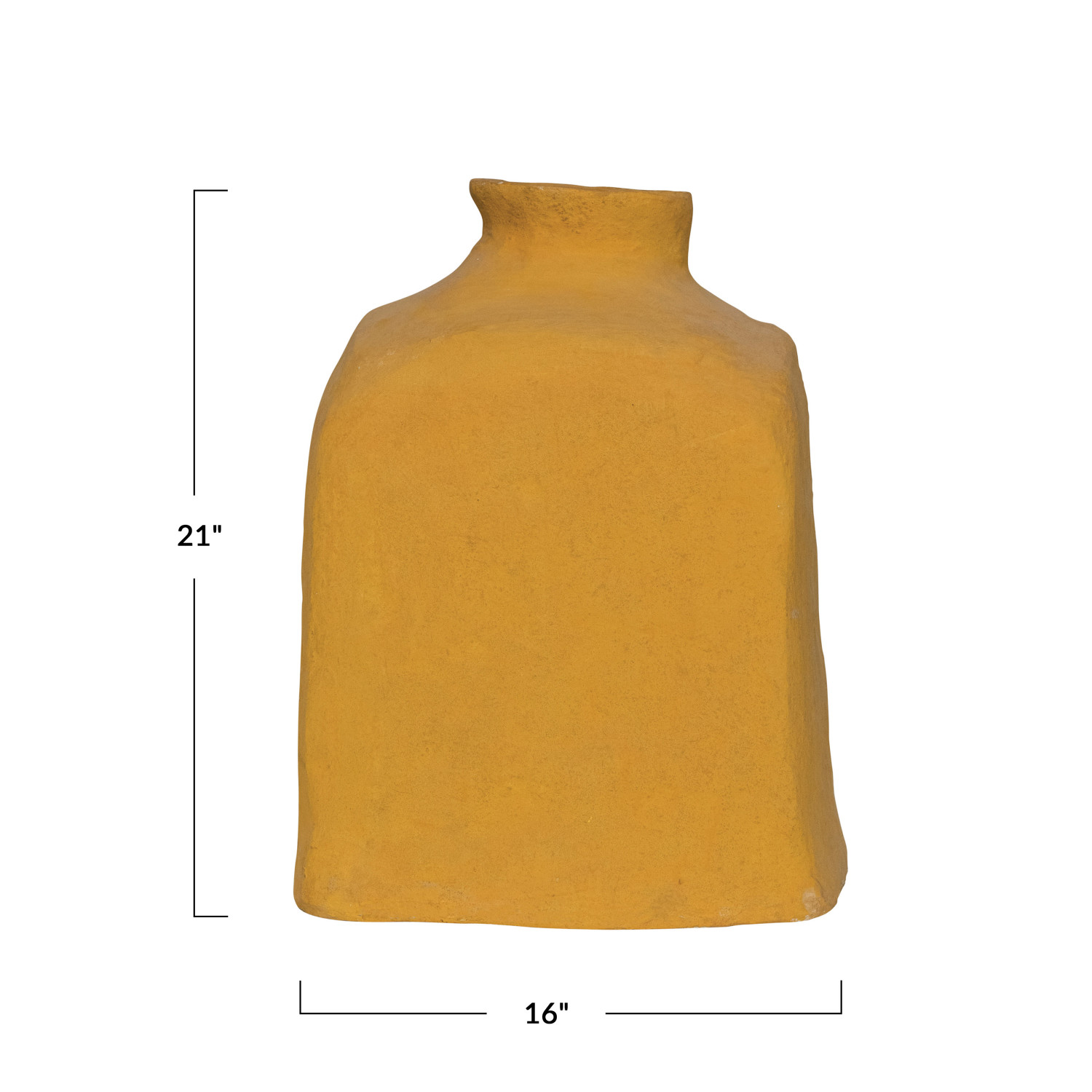 Add some style and personality to any home or office with these stunning vases. These vases come in various shapes, sizes, materials, and designs, offering a wide range of options to suit any preference and decor. Whether looking for a simple and elegant ceramic vase, a colorful and whimsical glass vase, a rustic and natural wood vase, or a modern and sleek metal vase, there is something for everyone in this collection. These vases are perfect for displaying flowers, plants, candles, or other decorative items, or simply as standalone accents that will enhance the beauty and charm of any space. Featuring a square shape and mustard color and texture from paper Mache, this floor vase stands tall at 21 inches and adds elegance and artistic flair to any room with its individual variations. Its bold and vibrant mustard color adds a pop of personality and warmth to any space making it the perfect complement to homes with eclectic, modern, or bohemian decor styles. The wide 7-inch round opening provides ample space to create stunning floral arrangements or showcase tall decorative branches, while its lightweight design allows for easy repositioning, giving anyone the flexibility to create different focal points in any home. Made of paper Mache.