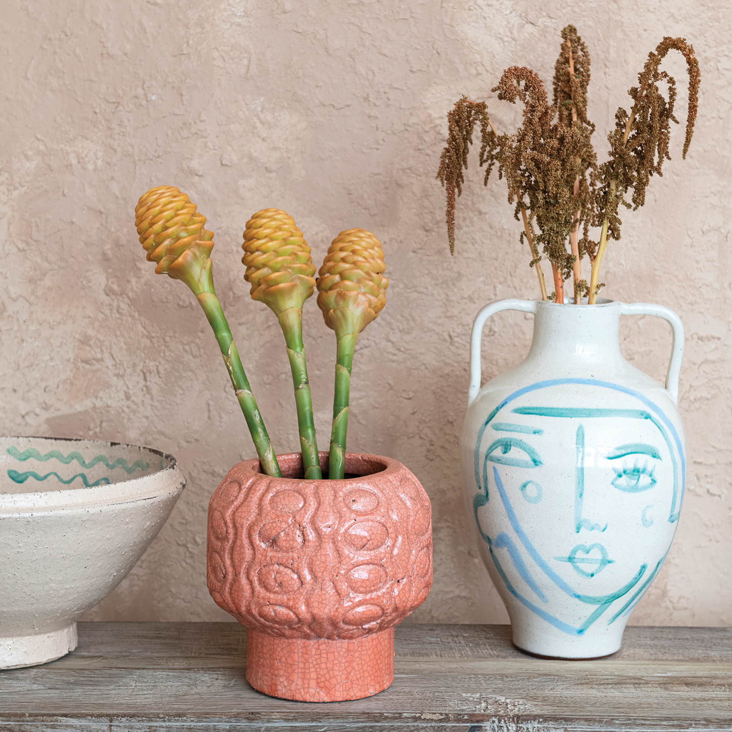 This hand-painted terra-cotta vase features an abstract face and crackle glaze in white, blue, and aqua colors. It is a unique and beautiful home accessory, made of baked clay with a porous and earthy texture. The vase has a round shape and wide opening, and its hand-painted design adds a playful and artistic touch. The crackle glaze creates a glossy surface, while the white, blue, and aqua color scheme adds a cozy and elegant look. This vase can be used to display fresh or artificial flowers, plants, or branches, or as a sculptural accent. Place it on tables, shelves, mantels, or windowsills, and create a cozy and inviting atmosphere in the home. It is suitable for farmhouse, coastal, French country, cottagecore, or boho style and adds personality and charm to any space. Truck shipping is required due to its size and weight.