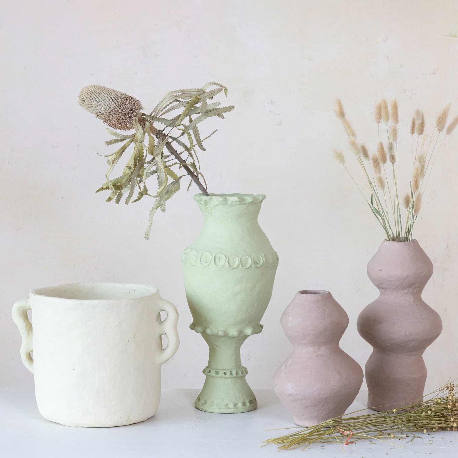 This large handmade paper mâché vase features a dusty rose color and smooth design, making it a beautiful and delicate home accessory. Made from paper pulp and glue, it has a round shape and narrow opening, and a soft, elegant look. It can be used as a decorative accent or to hold flowers, plants, or branches. Place it in any room of the house, from the living room to the bedroom, and create a cozy and romantic atmosphere. This vase is suitable for farmhouse, French country, boho, global, or modern styles, adding softness and romance to any space. It is a wonderful gift for anyone who loves art and beauty, and each vase will vary slightly in color and pattern due to the handmade process.