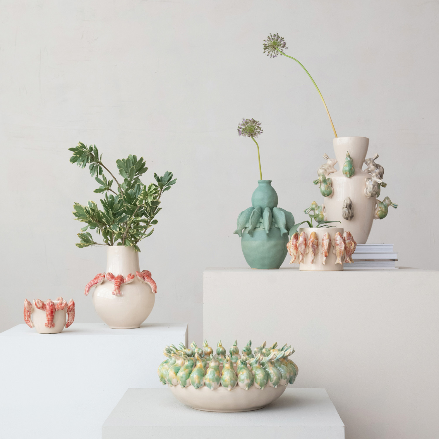 Catalog Name: 8-3/4" Round x 11-1/4"H Stoneware Vase w/ 3D Lobsters, Reactive Glaze, Cream & Orange Color, Truck Ship (Each One Will Vary)