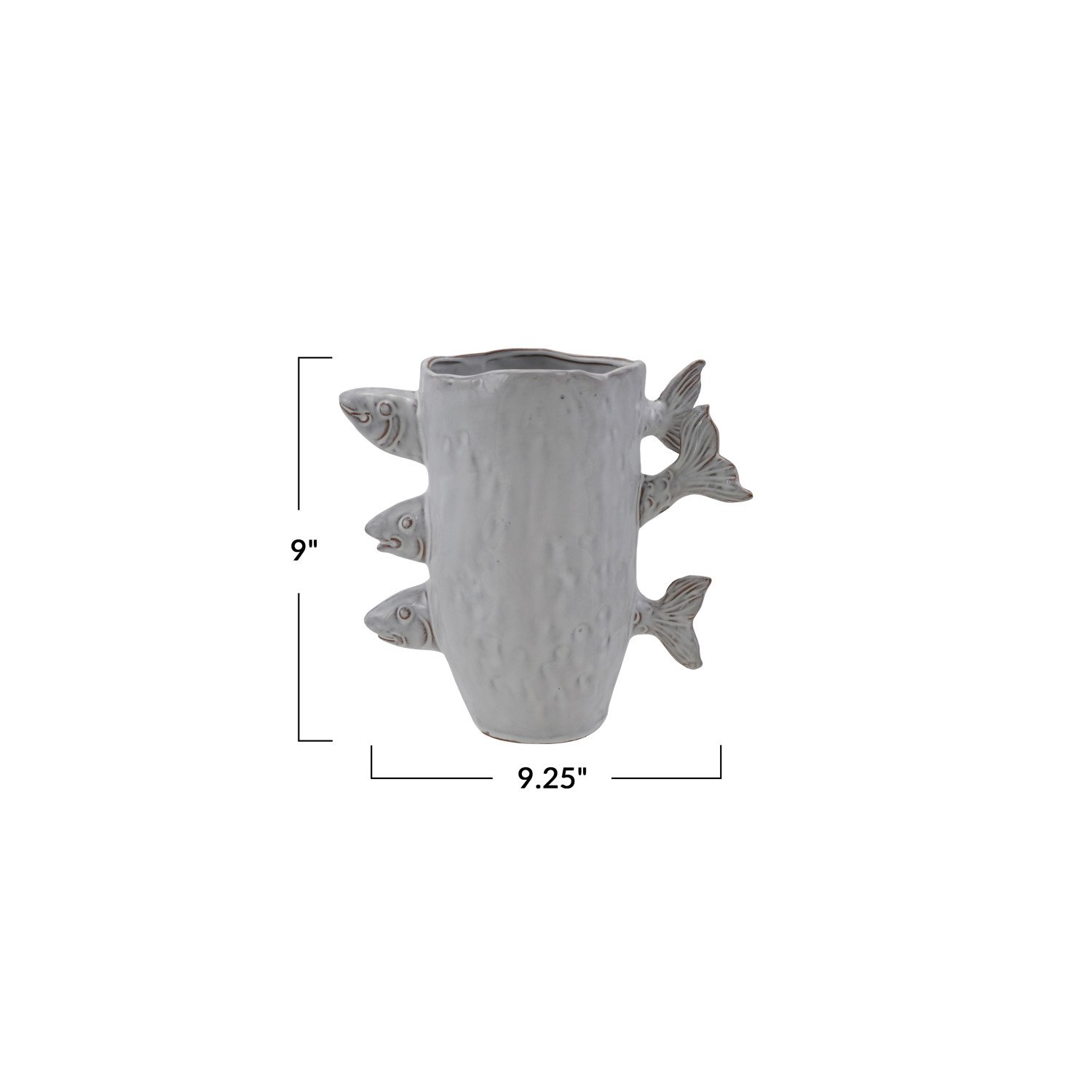 Catalog Name: 9-1/4"L x 5"W x 9"H Stoneware Vase w/ 3D Fish, Reactive Glaze, White (Each One Will Vary)