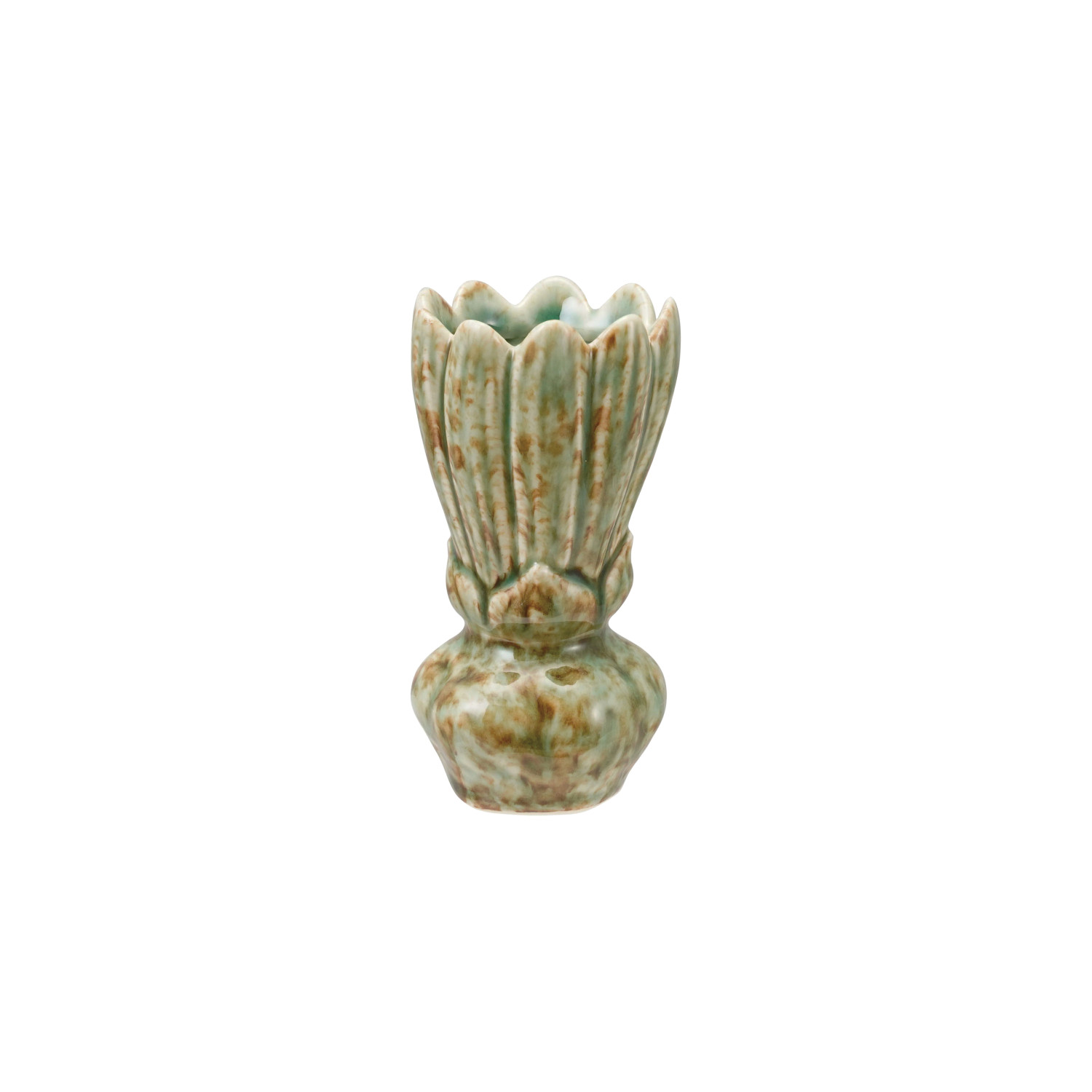 Catalog Name: 2-1/4" Round x 4-3/4"H Stoneware Flower Shaped Vase, Reactive Glaze, Green (Each One Will Vary)