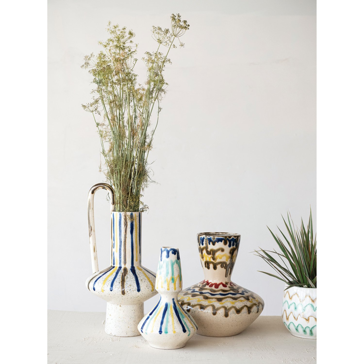 Catalog Name: 7-1/2" Round x 12-1/4"H Hand-Painted Stoneware Vase, Reactive Crackle Glaze, Blue, Yellow & Cream Color Speckled (Each One Will Vary)