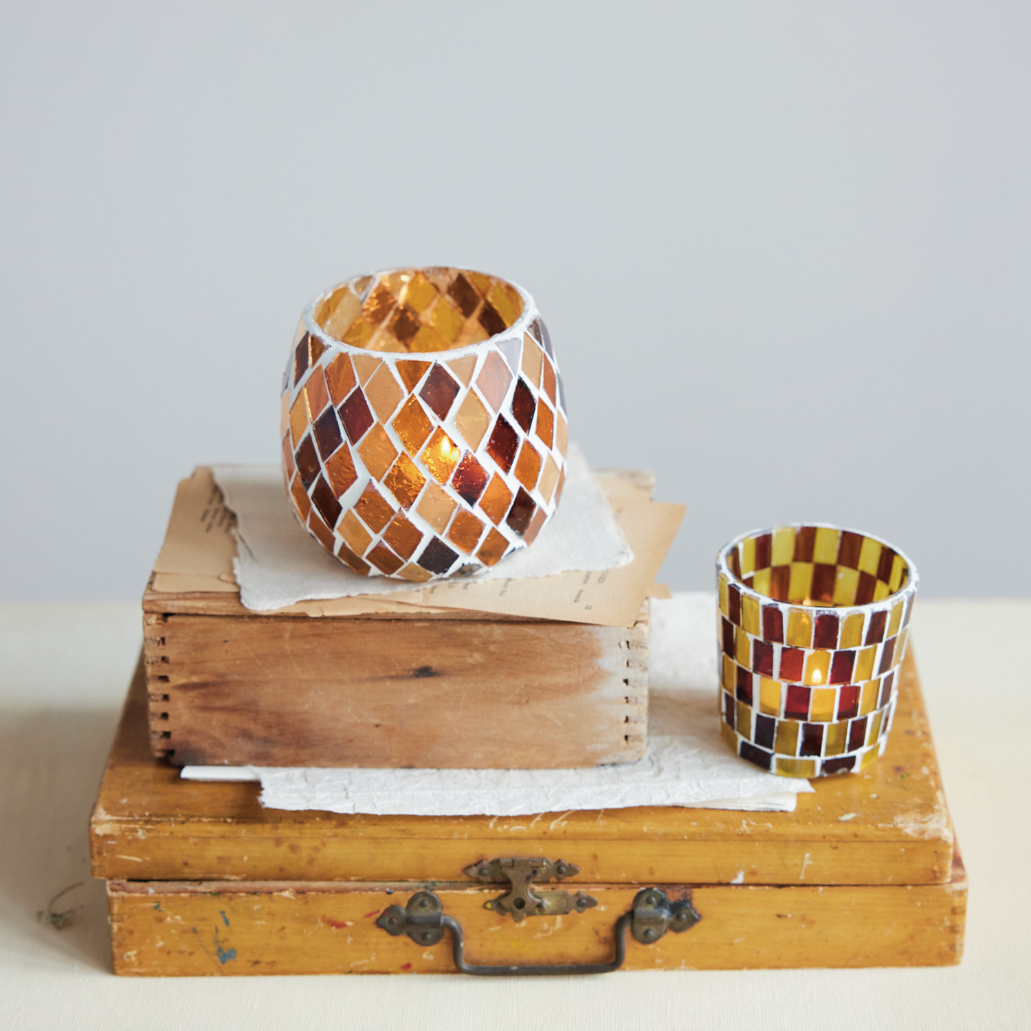 Recycled Glass Mosaic Tealight/Votive Holder, Amber Color & Brown