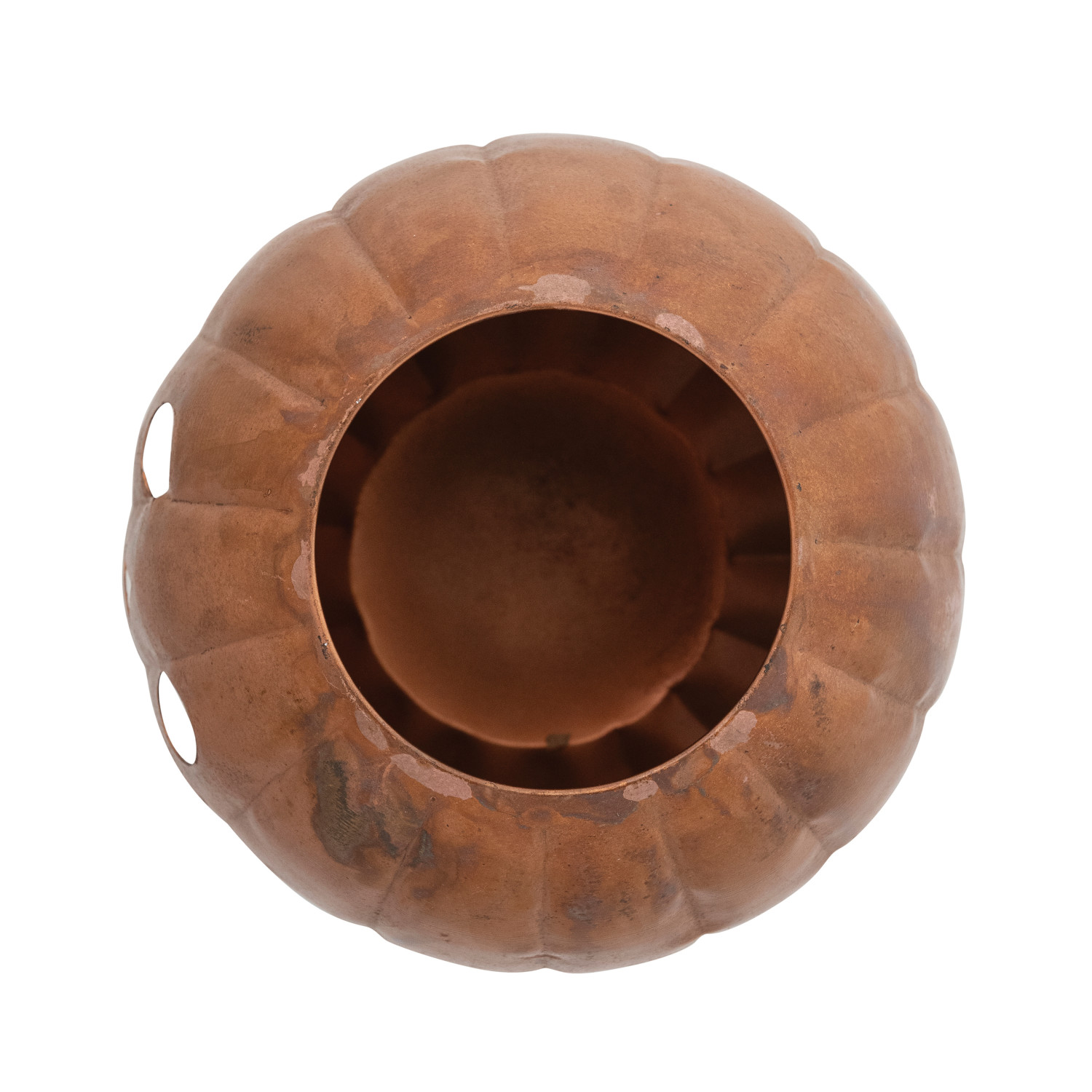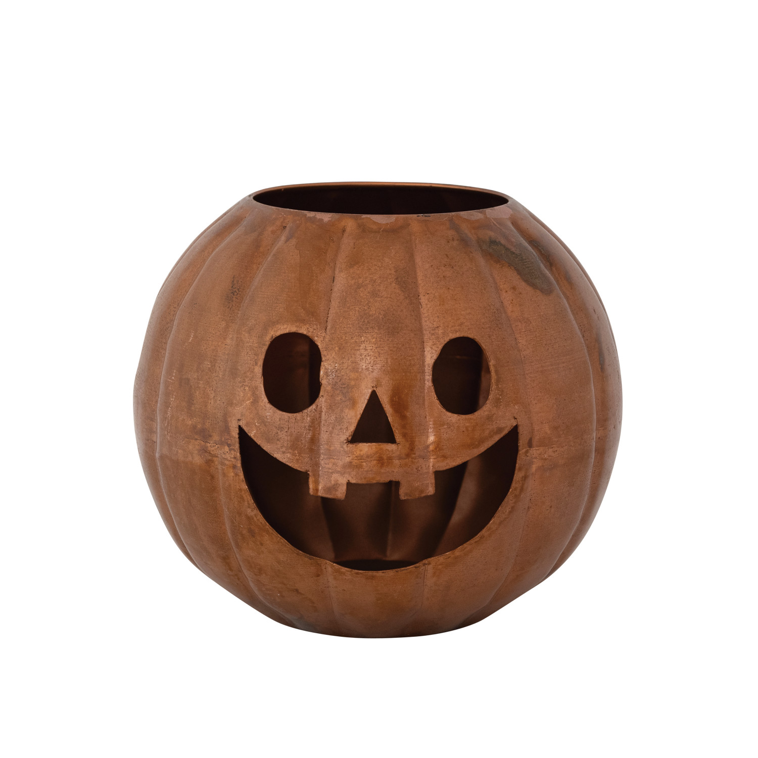 Catalog Name: 9-3/4" Round x 8-1/4"H Metal Jack-O-Lantern Candle Holder w/ Cut-Outs, Copper Finish