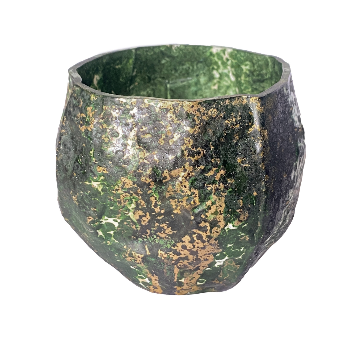 Catalog Name: 4-1/2" Round x 3-3/4"H Hand-Blown Mercury Glass Tealight/Votive Holder, Distressed Green & Gold Finish (Each One Will Vary)