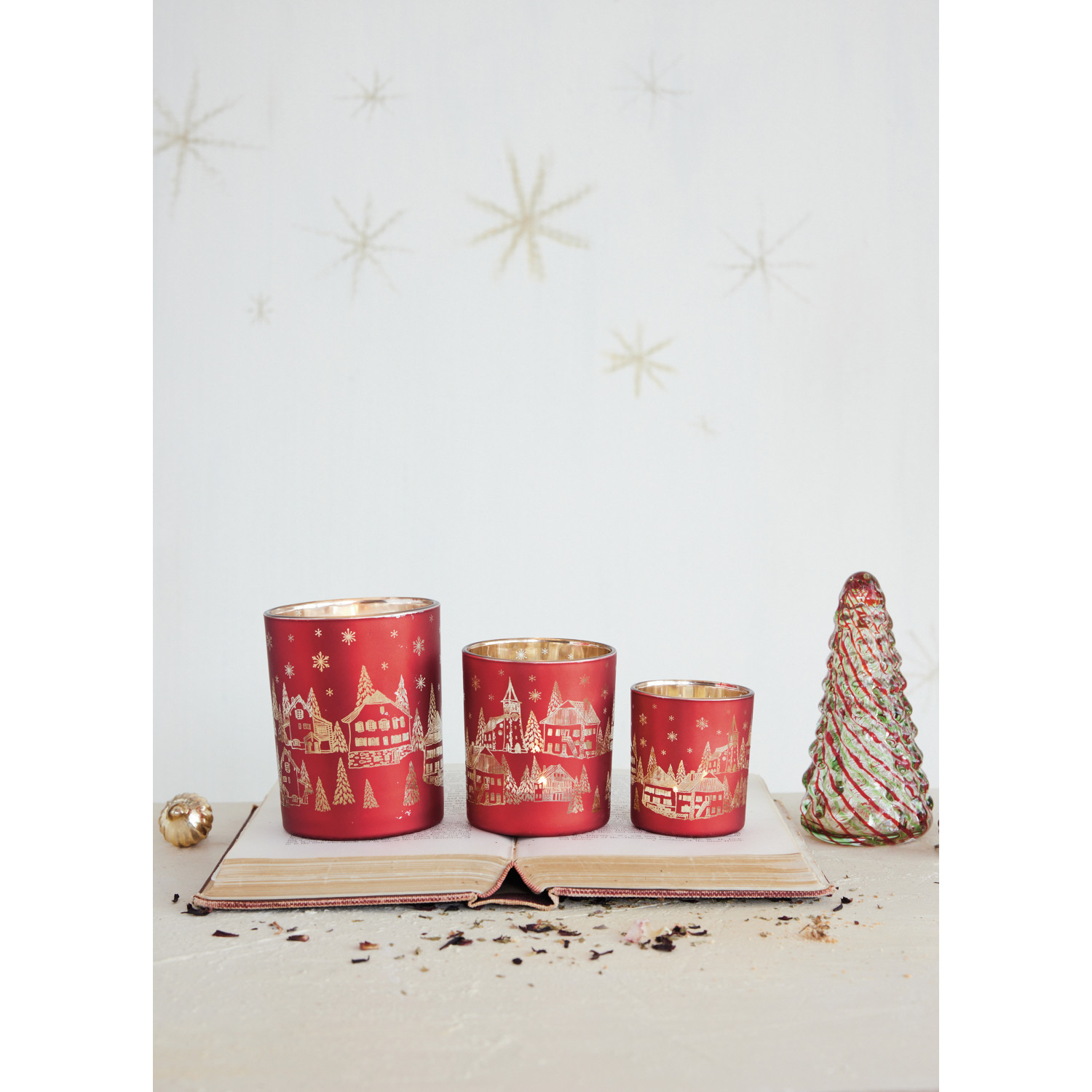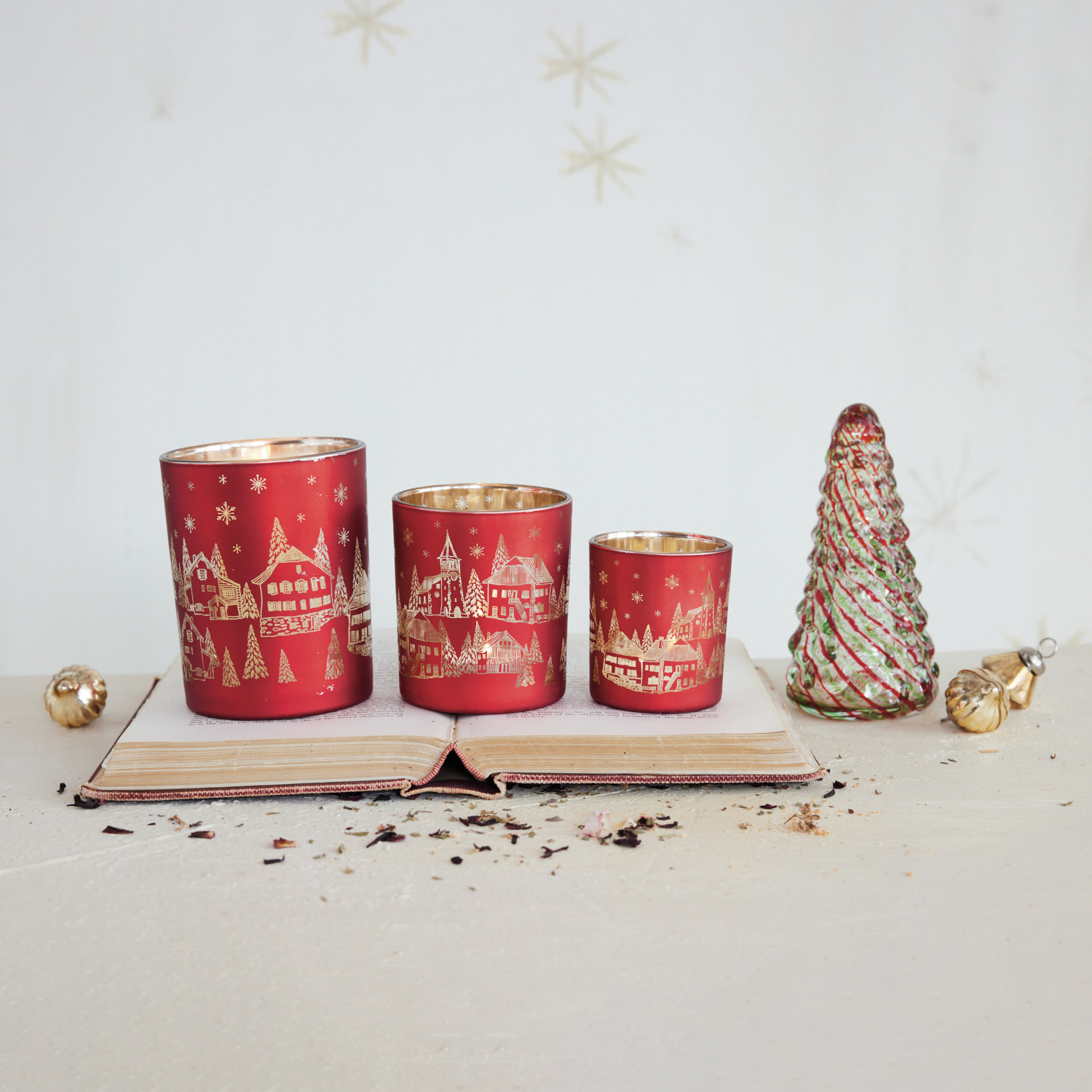 Glass Tealight/Votive Holder with Laser Etched Scene, Red & Gold Finish