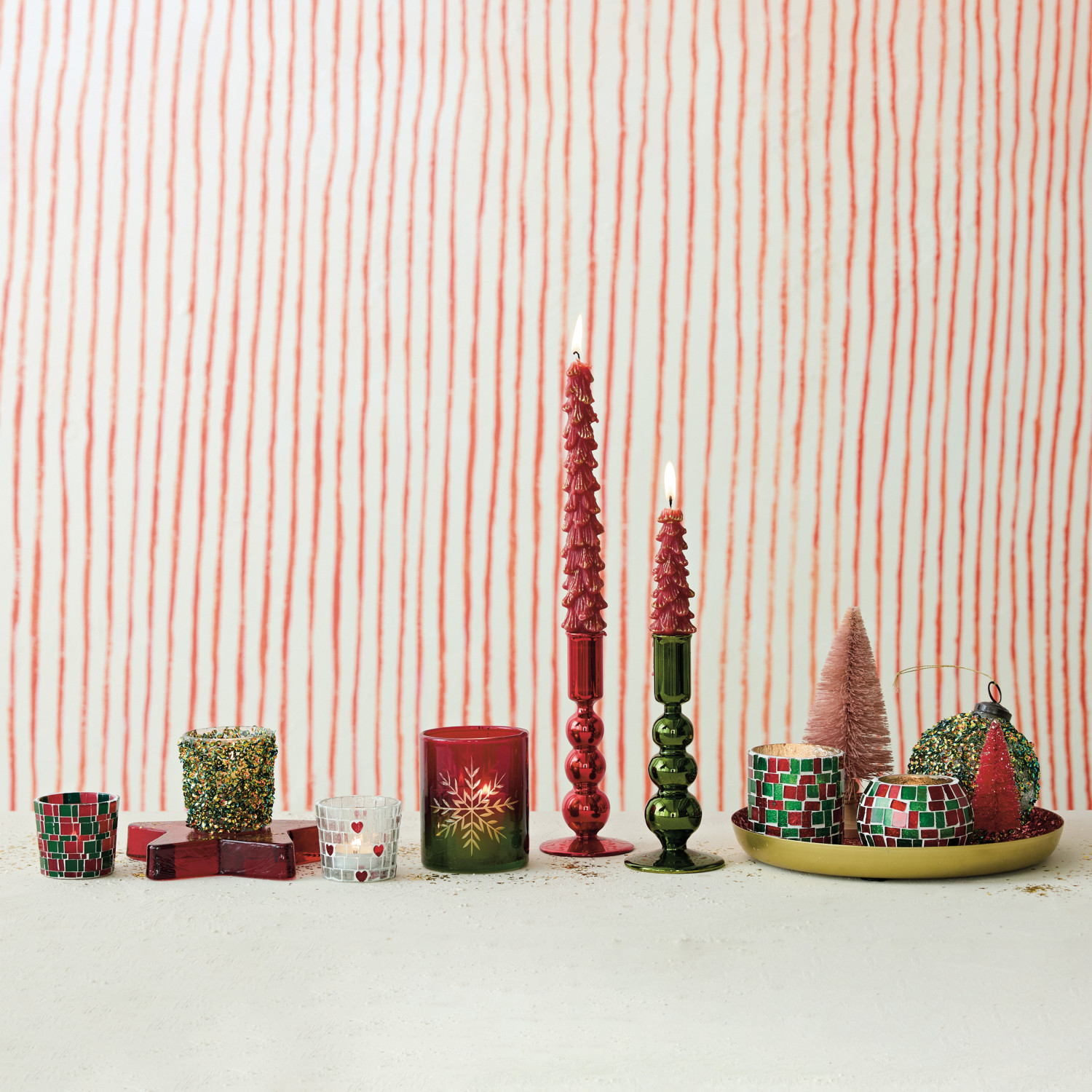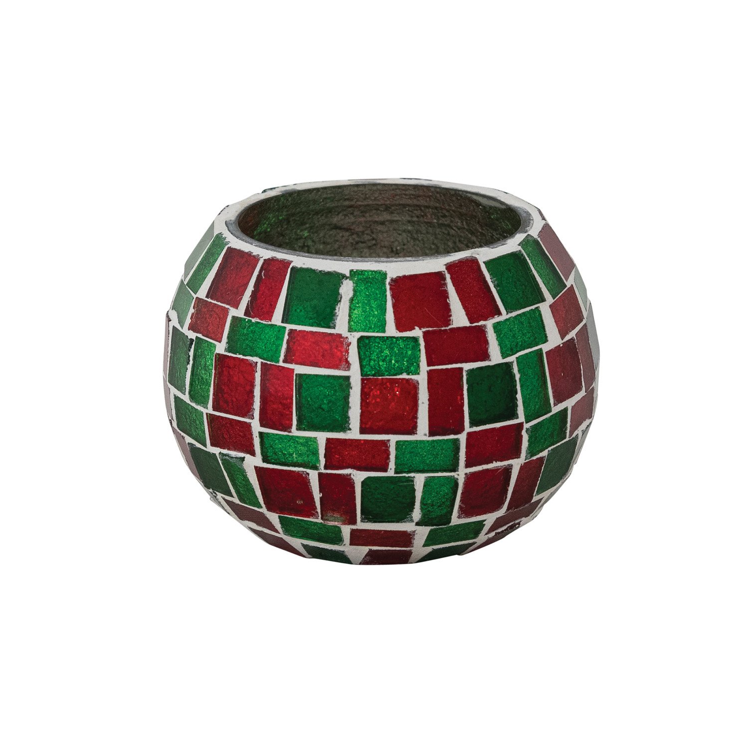 Catalog Name: 3-1/2" Round x 2-1/2"H Recycled Glass Mosaic Tealight/Votive Holder, Red, Green & White