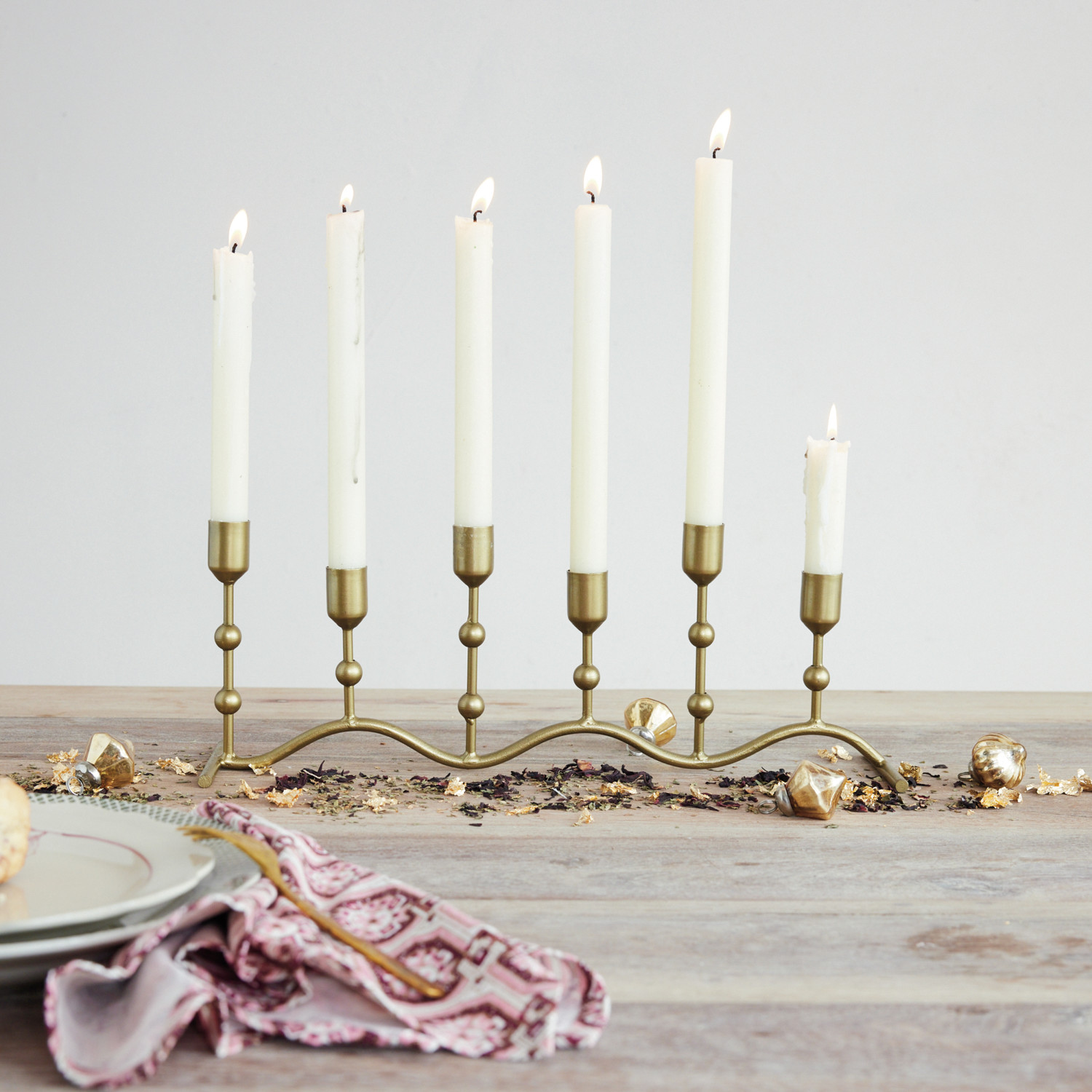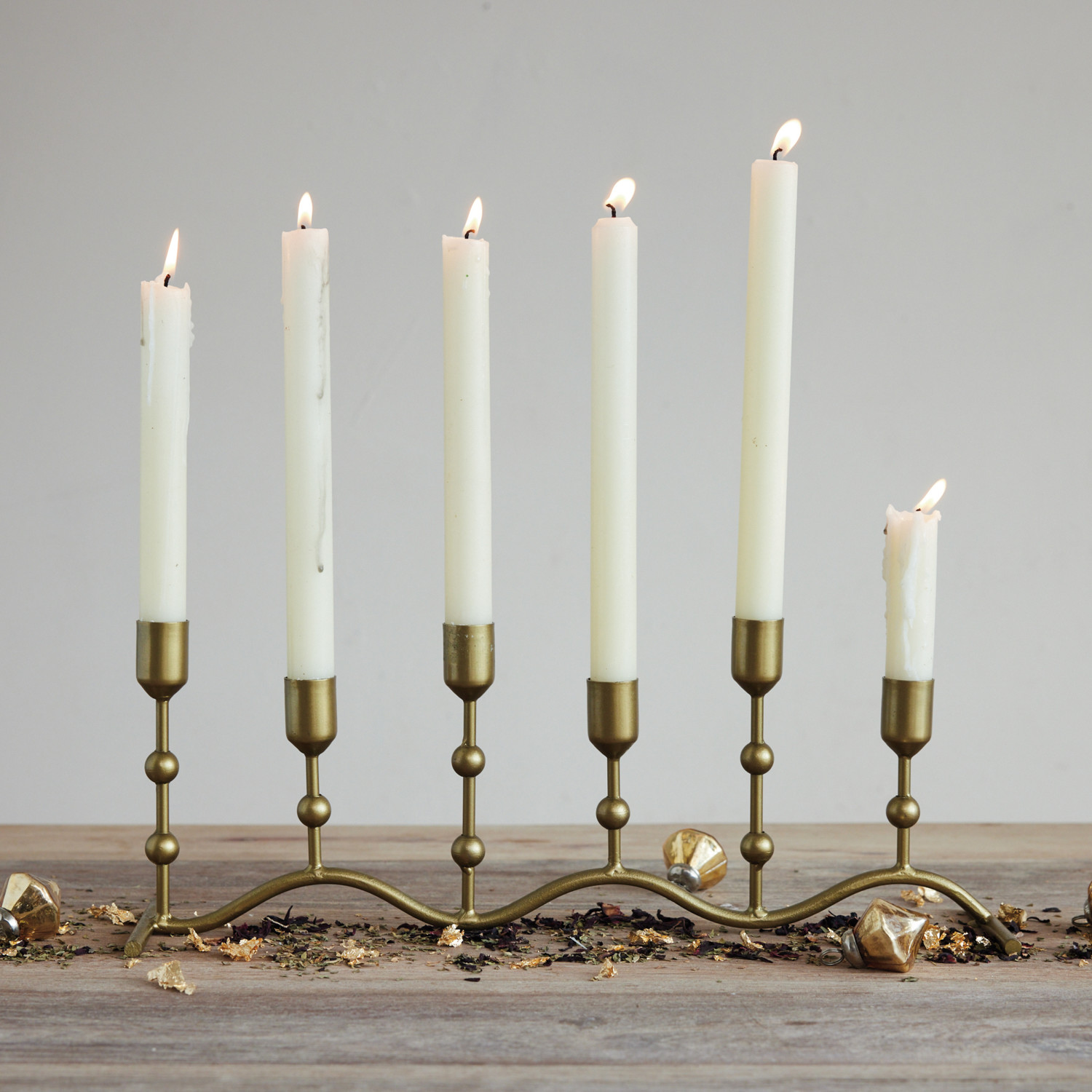 Catalog Name: 15-3/4"L x 4"W x 5-3/4"H Hand-Forged Iron Candle Runner w/ Balls & Curved Base, Antique Gold Finish (Holds 6 Tapers)