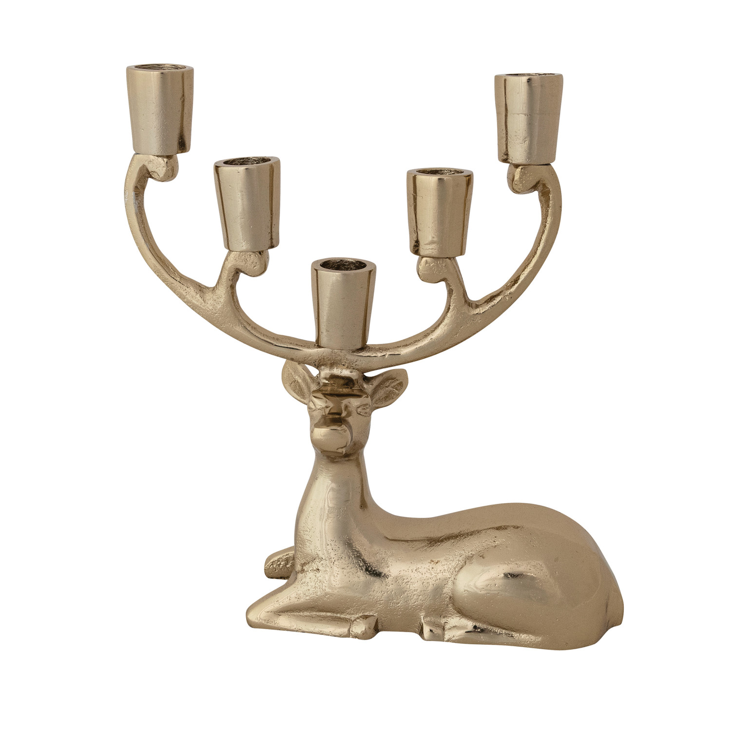 Catalog Name: 9-1/2"L x 3"W x 10-1/4"H Cast Aluminum Deer Candelabra, Gold Finish (Holds 5 Tapers)