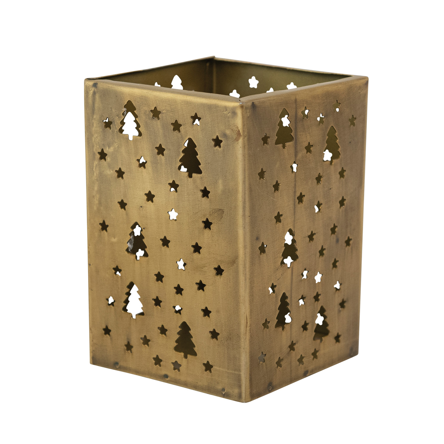 Catalog Name: 3-1/4" Square x 4-3/4"H Metal Tealight/Votive Holder w/ Trees & Stars Cut-Outs, Gold Finish