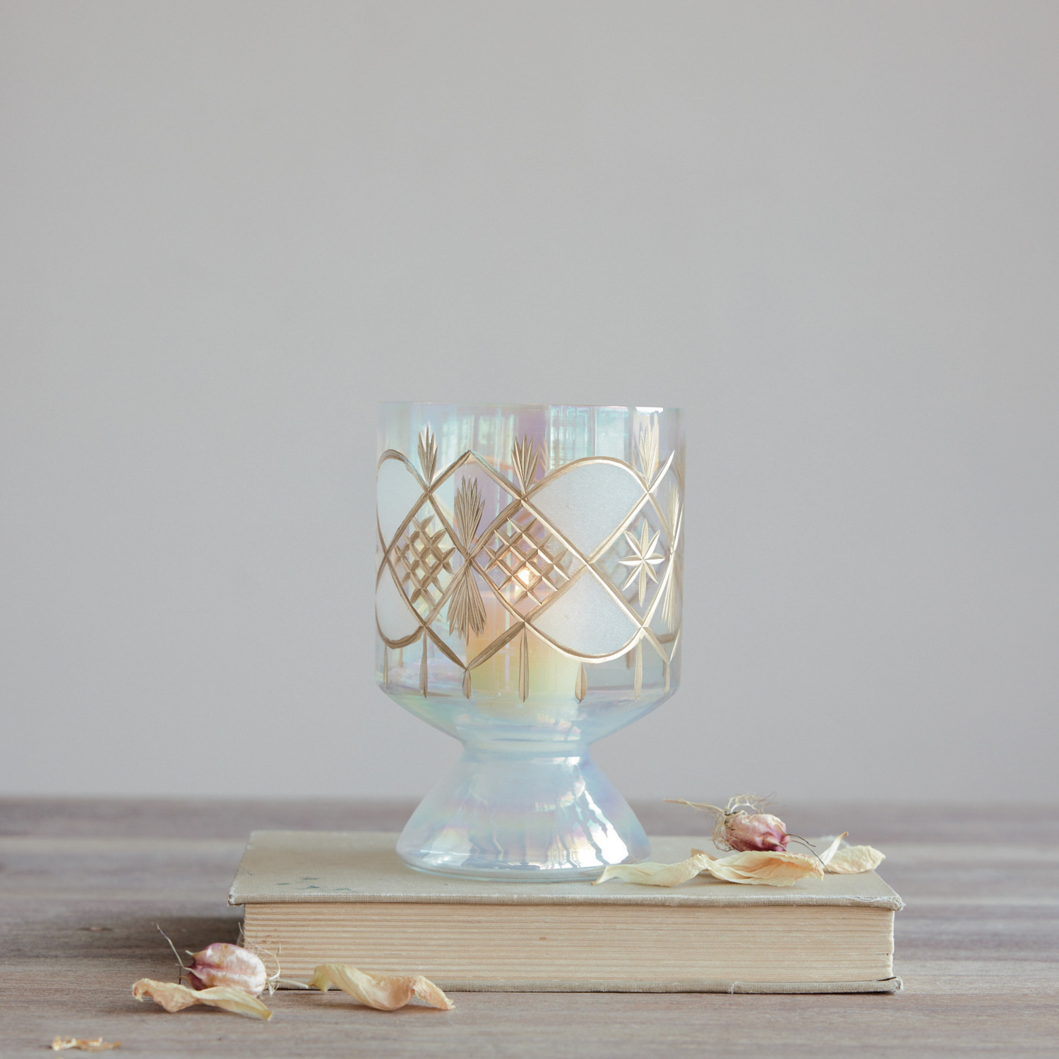 Hand-Blown Etched Glass Footed Tealight/Votive Holder with Design, Iridescent & Gold Finish
