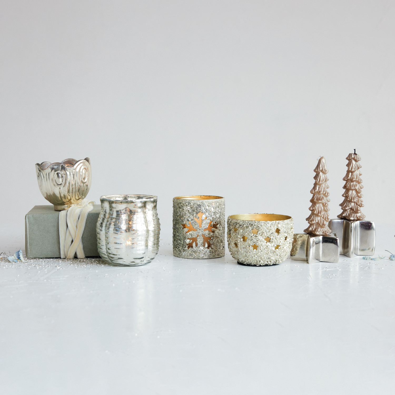 Metal Tealight/Votive Holder with Mica Flakes & Snowflake Cut-Outs, Antique Silver Finish