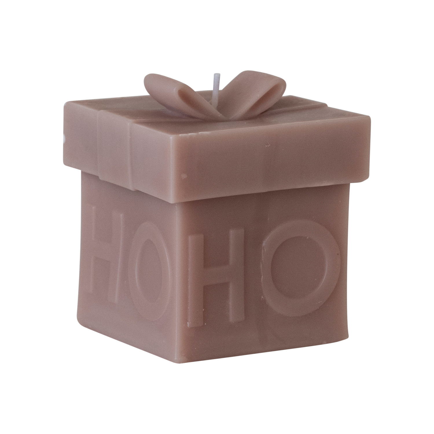 Catalog Name: 3-1/2" Square x 4"H Unscented Gift Box Shaped Candle "Ho Ho Ho", Khaki Color (Approximate Burn Time 50 Hours)