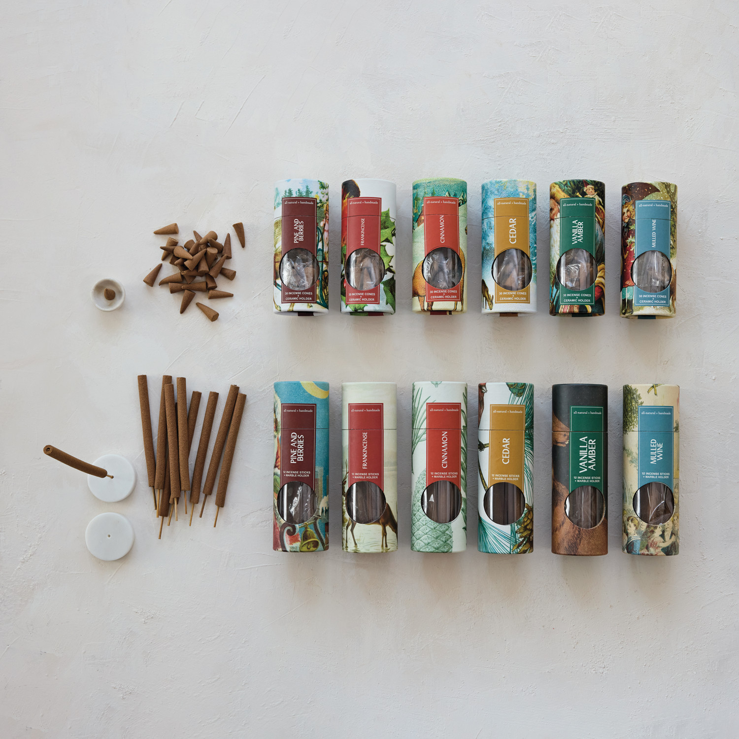 Catalog Name: 1"L 30 Piece All Natural Handmade Mulled Wine Scented Incense Cones in Printed Tube w/ 1-1/2" Round White Ceramic Incense Holder, Set of 31 (Est. Burn Time 20 Minutes)