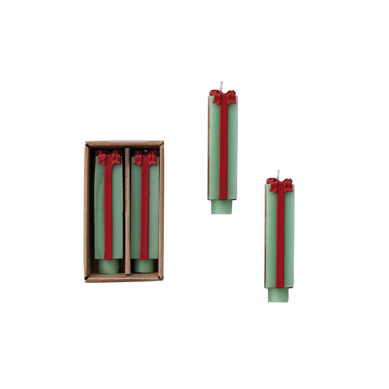 Catalog Name: 4-3/4"H Unscented Package Shaped Taper Candles in Box, Green & Red, Set of 2 (Est. Burn Time 6 Hours)