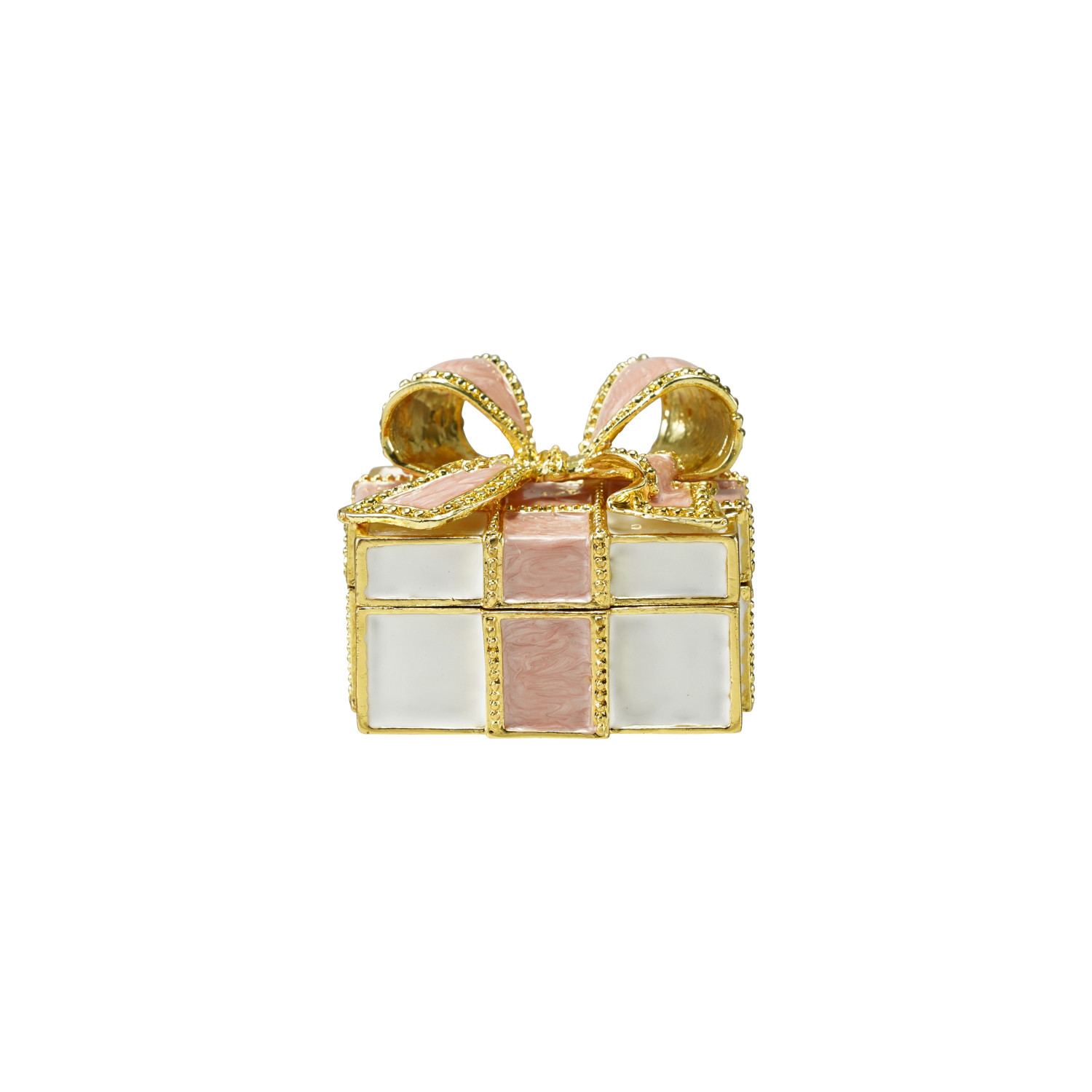 Catalog Name: 2-1/4"L x 1-1/2"W x 1-3/4"H Enameled Metal Gift Shaped Trinket Box w/ Jewels, Gold Finish & Pink