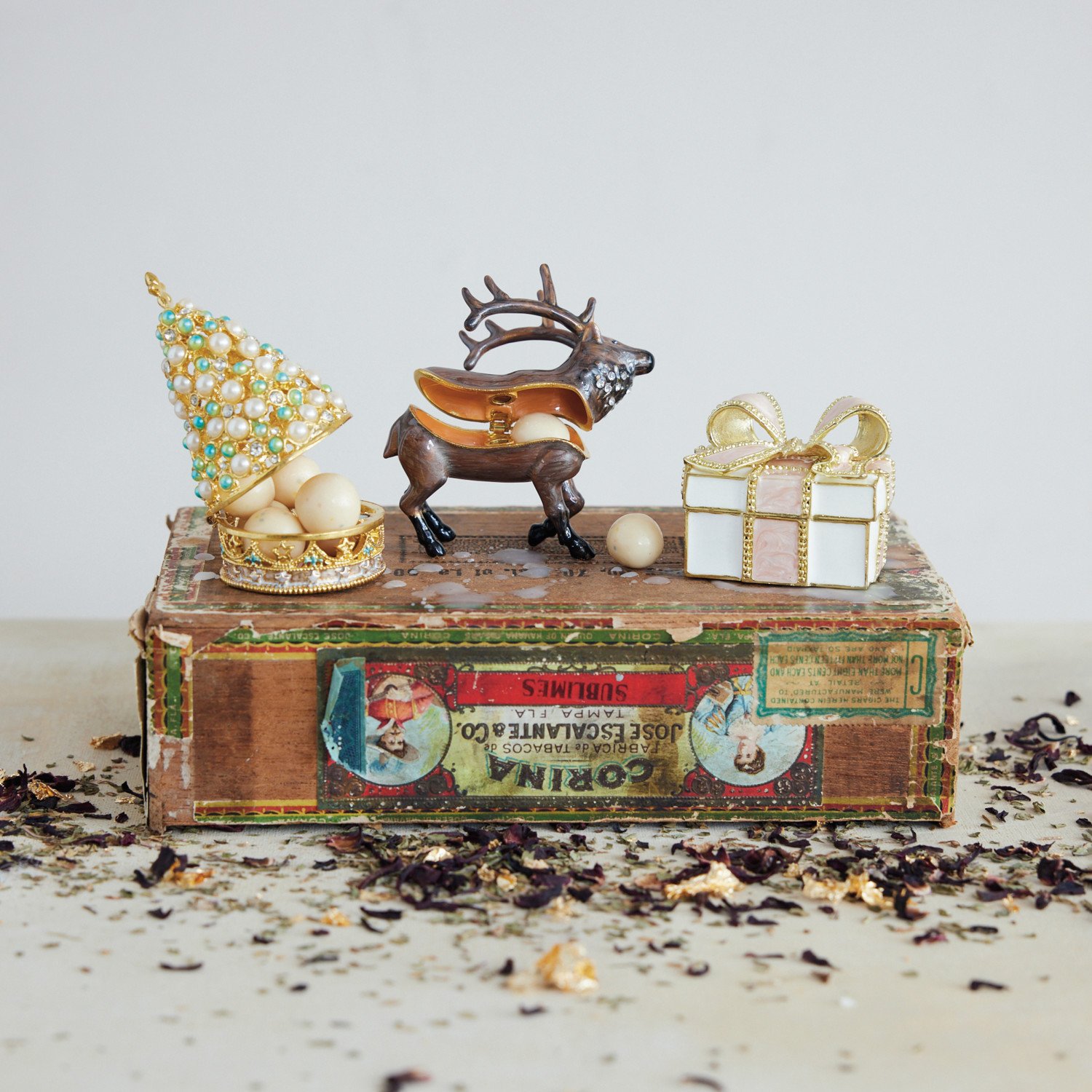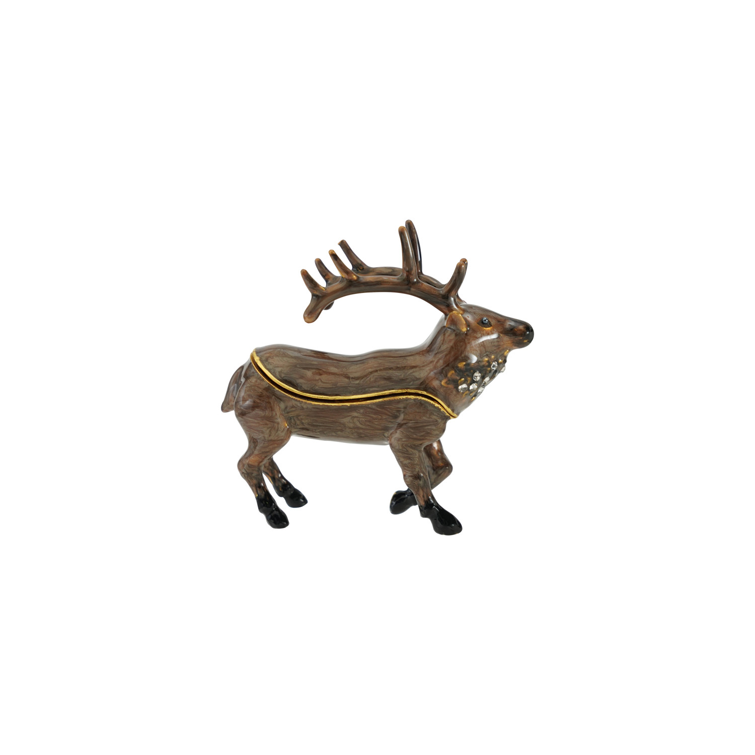 Catalog Name: 3"L x 3"H Enameled Metal Caribou Shaped Trinket Box w/ Jewels, Gold Finish & Brown