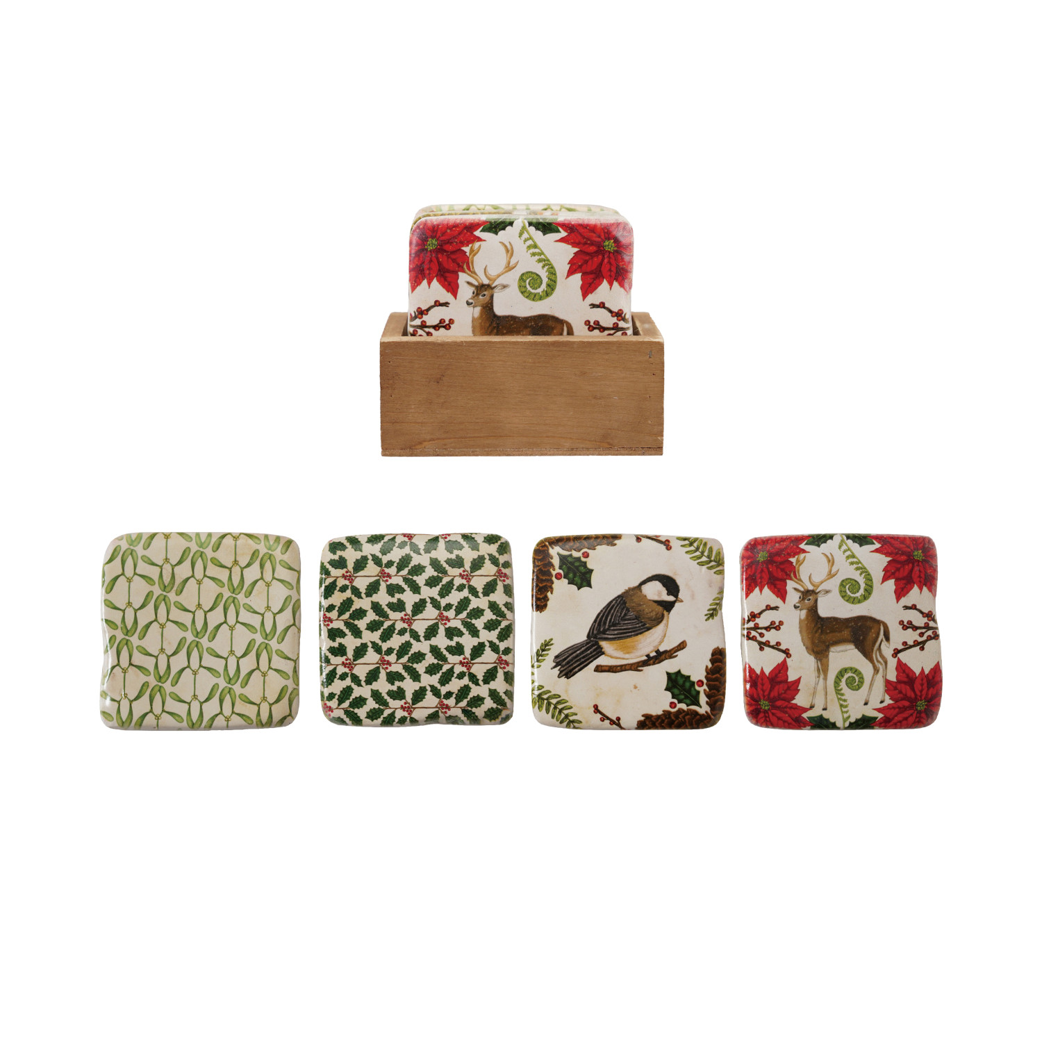 Catalog Name: 4" Square Resin Coasters w/ Seasonal Botanicals/Animals in Wood Box, Multi Color & Natural, Set of 5 ©