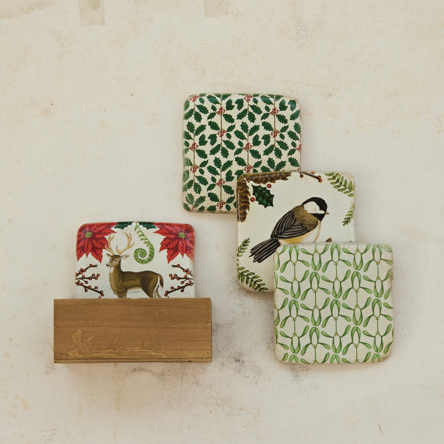 Resin Coasters with Seasonal Botanicals/Animals in Wood Box, Set of 5 ©