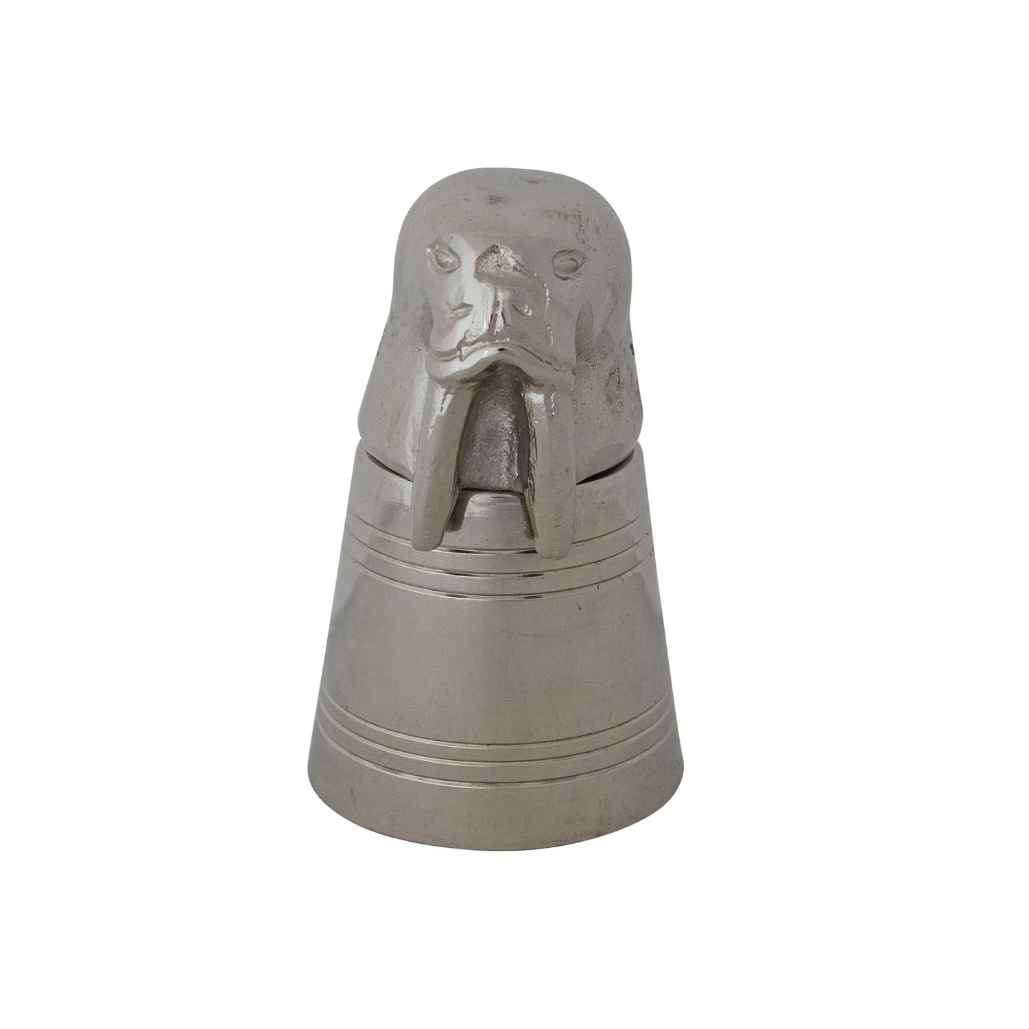 Catalog Name: 2-1/4" Round x 3-3/4"H 2 oz. Cast Aluminum & Stainless Steel Walrus Head Jigger in Kraft Box, Nickel Finish
