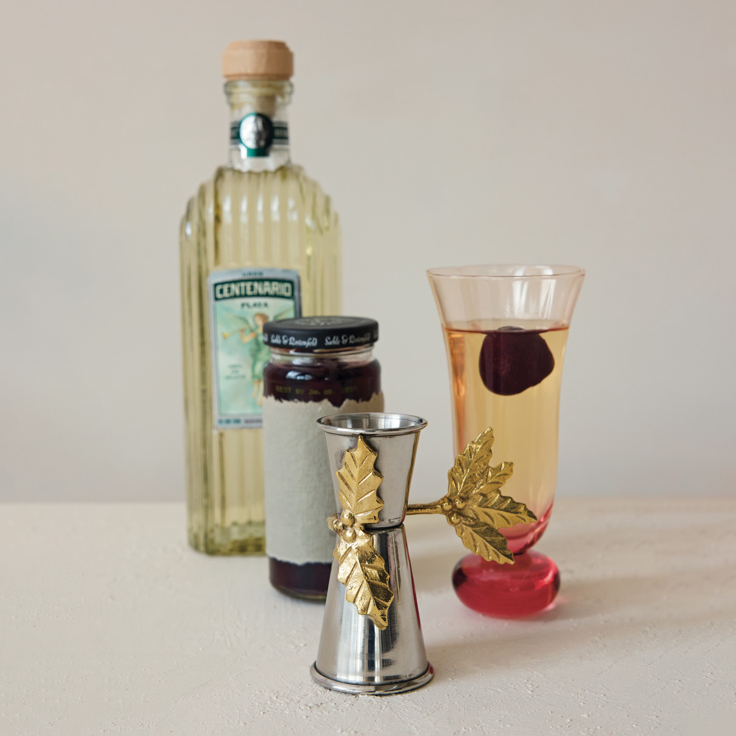Stainless Steel Jigger with Brass Holly Leaves & Berries Shaped Handle