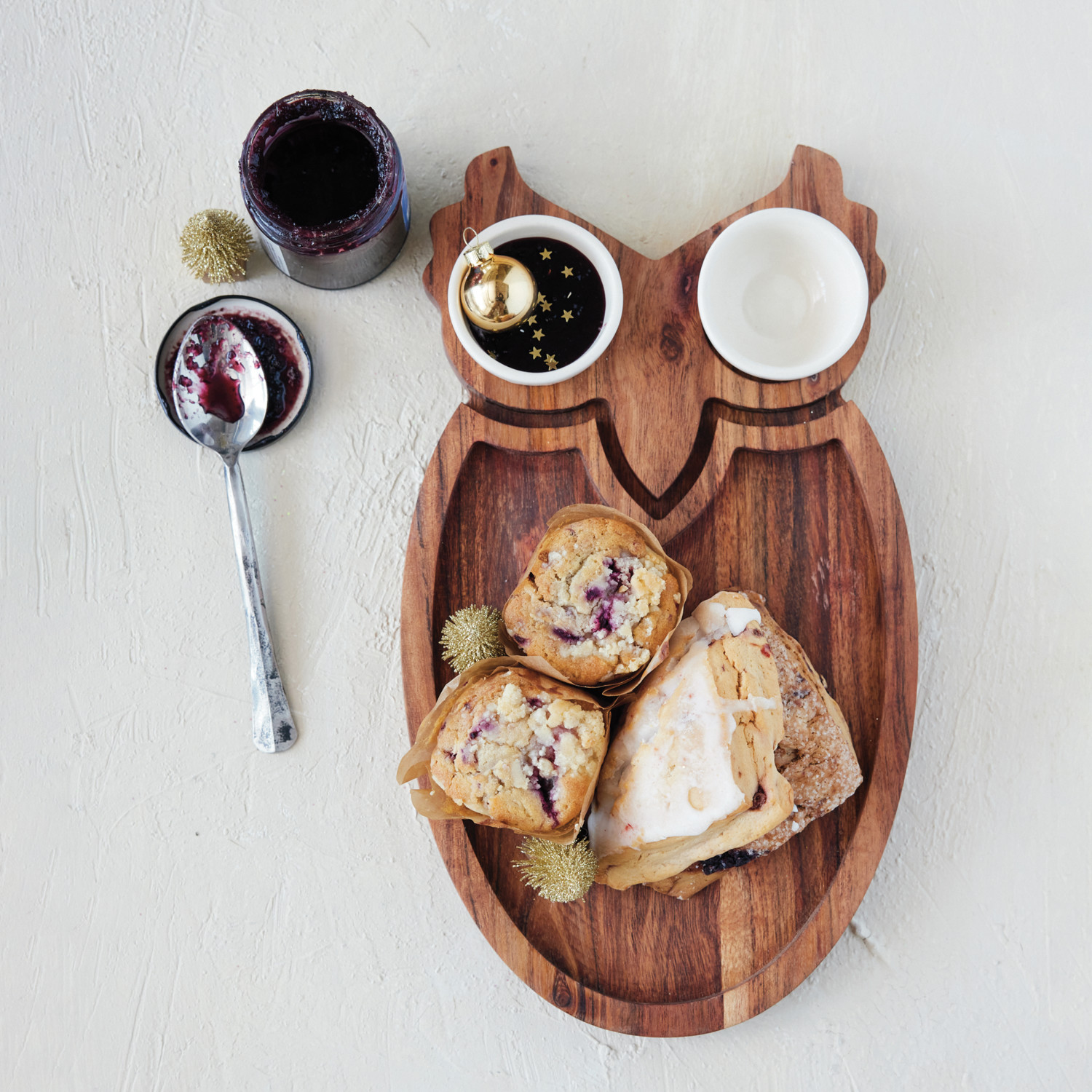Catalog Name: 16"L x 9-1/4"W Acacia Wood Owl Shaped Platter w/ (2) 3" Round x 1-1/2"H Stoneware Bowls, Natural & White, Set of 3