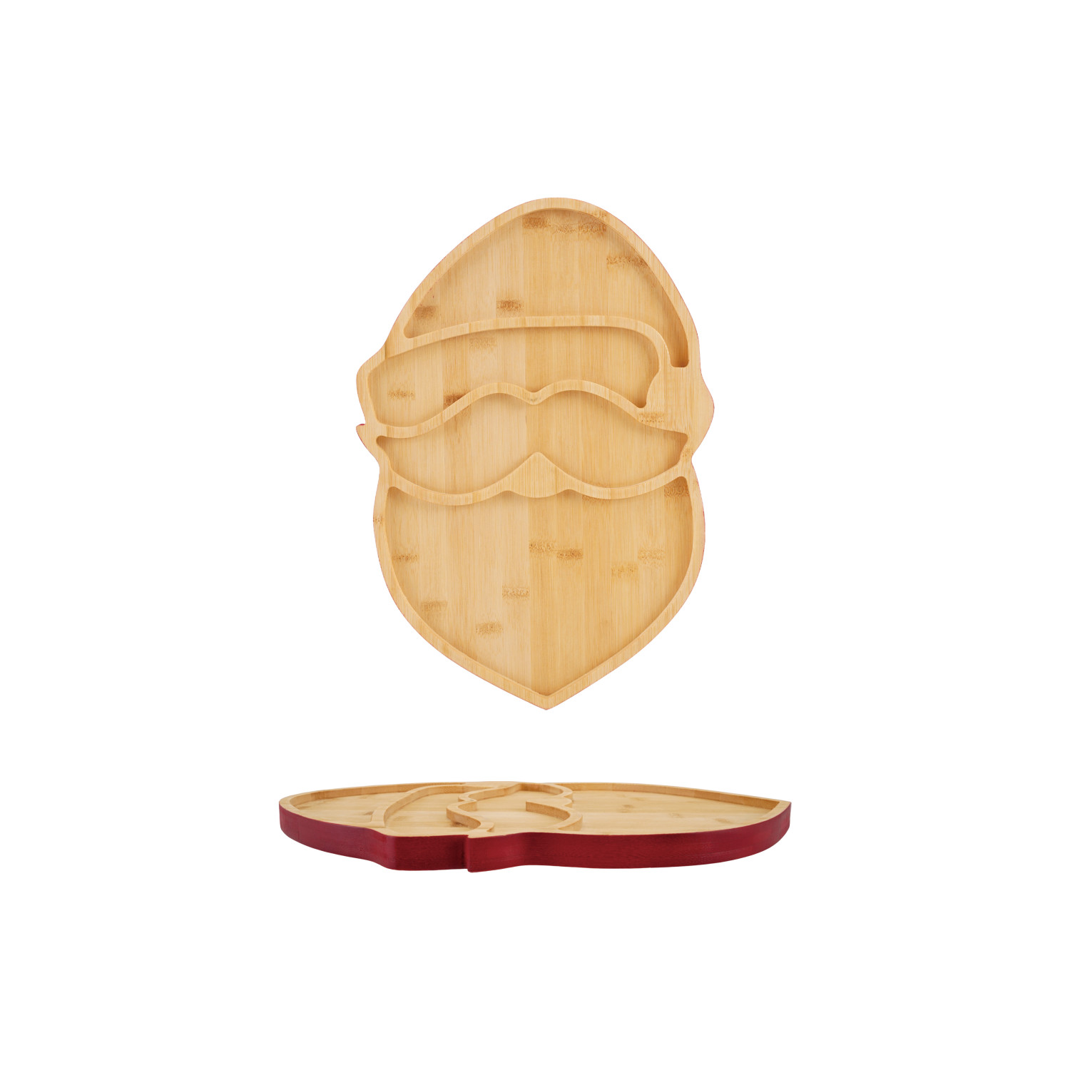 Catalog Name: 11-1/2"W x 16"H Bamboo Santa Head Shaped Cheese/Serving Board w/ Colored Edge & 4 Sections, Natural & Red