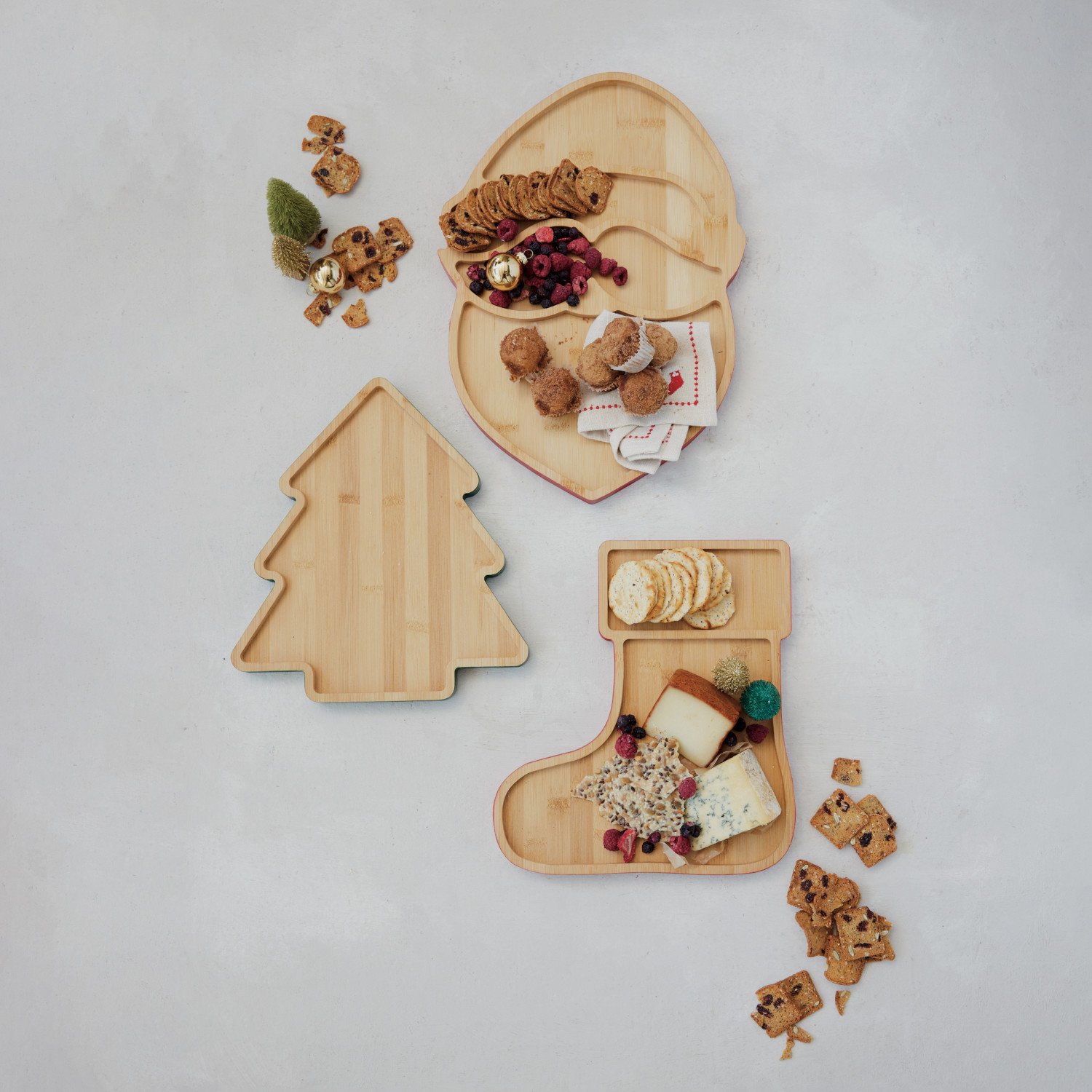 Bamboo Santa Head Shaped Cheese/Serving Board with Colored Edge & 4 Sections, Natural & Red
