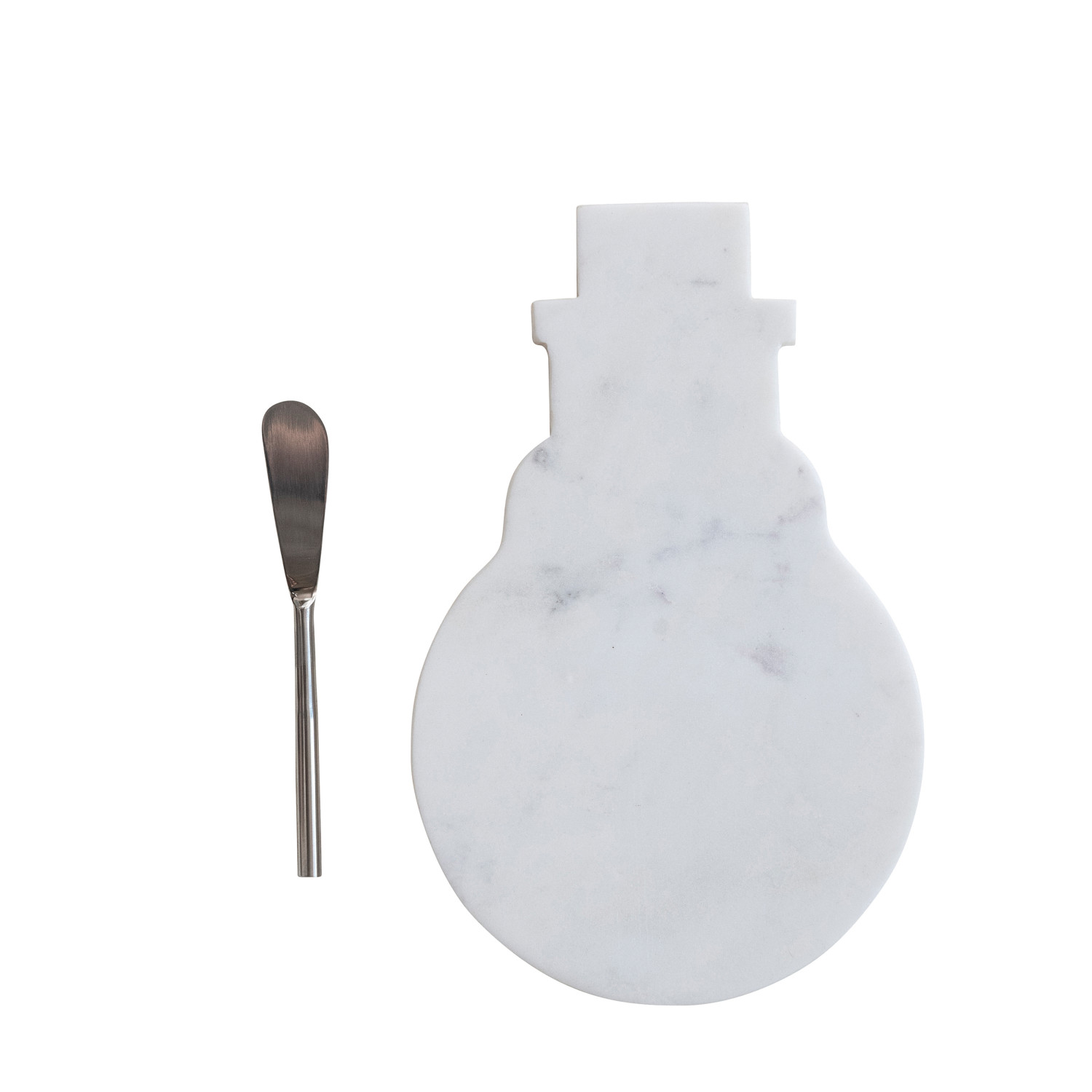 Catalog Name: 11"L x 7"W Marble Snowman Shaped Cheese/Serving Board w/ Stainless Steel Canape Knife, White & Nickel Finish, Set of 2 Tied w/ Jute